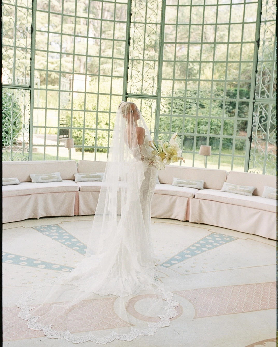 We wanted a wedding that felt true to us. We wanted to incorporate our creativity and love for fashion and travel as much as possible. We found this incredible villa (Domain Rocabella) tucked in a beautiful sea side town in La Pradet, France, in the French Riviera. The villa truly made our dreams come true, every room was beautifully designed with a mix of modern and French culture. Our favorite rooms were the massive light pink foyer and the green room with a beautiful pink mural floor and big sea view windows.