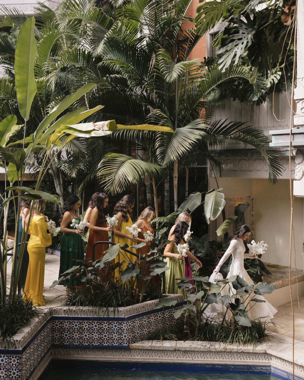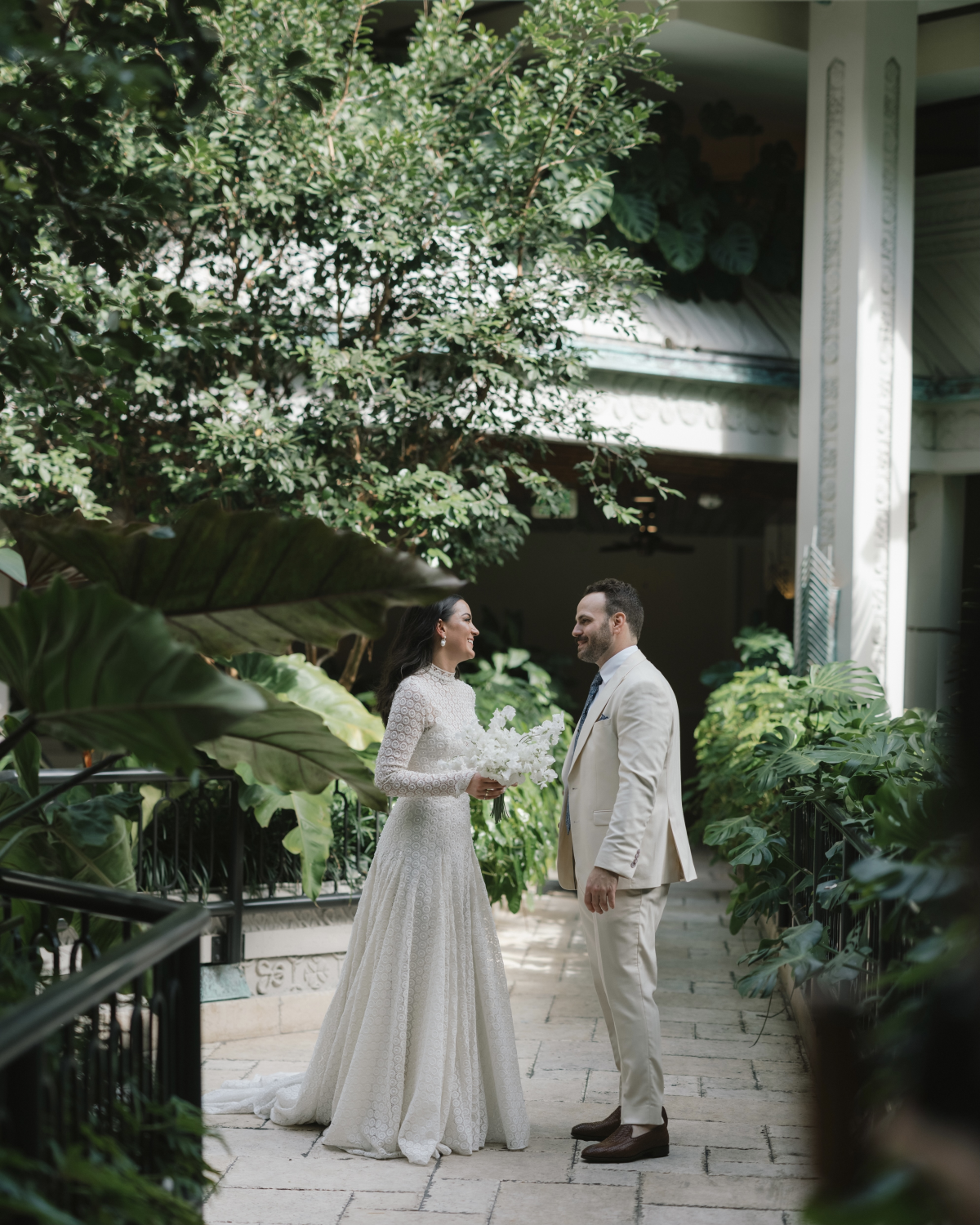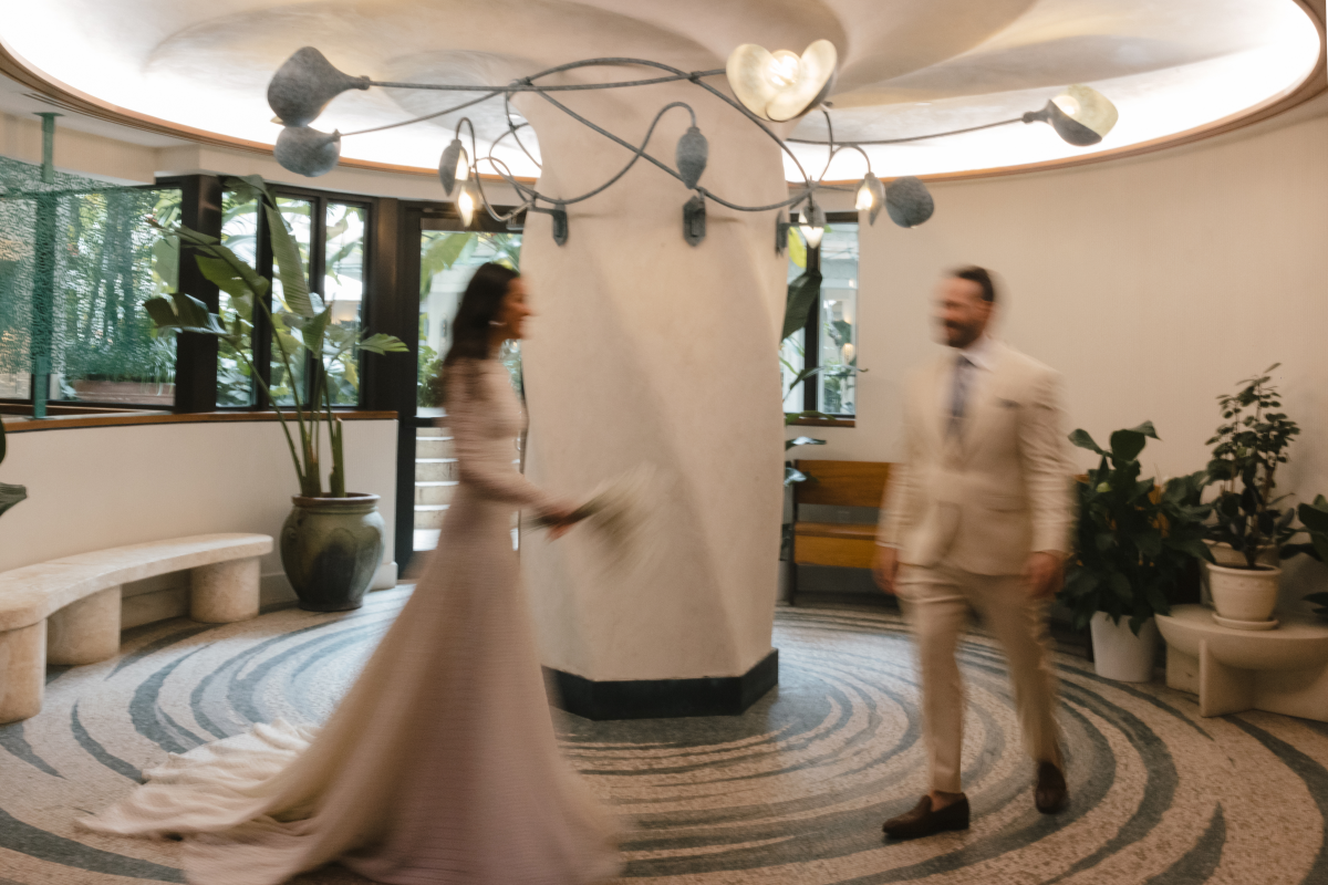 Our wedding took place about a block away from where our relationship blossomed. During our first years of dating, Greg lived in the eclectic Miami neighborhood, Coconut Grove. It’s really where we slowly got to know one another and before long, fell in love. Coconut Grove is one of the oldest parts of modern Miami and that character resonates throughout with its thoughtfully curated homes and bungalows, century-old banyan trees, peacocks roaming the streets and sailboats dotting the bay—not to mention the great restaurants, bars and shops. During the early days of the pandemic when the streets were quiet, we’d take long walks and enjoy it almost all to ourselves. During those walks, we’d always pass The Mayfair House Hotel & Garden and admire its unique design elements and surrounding environment. It was a full circle moment when we chose it for our wedding celebration. The Mayfair originally opened in 1985 and was reimagined in 2022, staying true to architect Kenneth Treister’s original features. Instead of a proper lobby, you can get lost in its tropical botanical courtyard overflowing with balconies of monstera, bird of paradise plants and mosaic fountains. This boutique hotel really pays tribute to everything the Grove embodies.