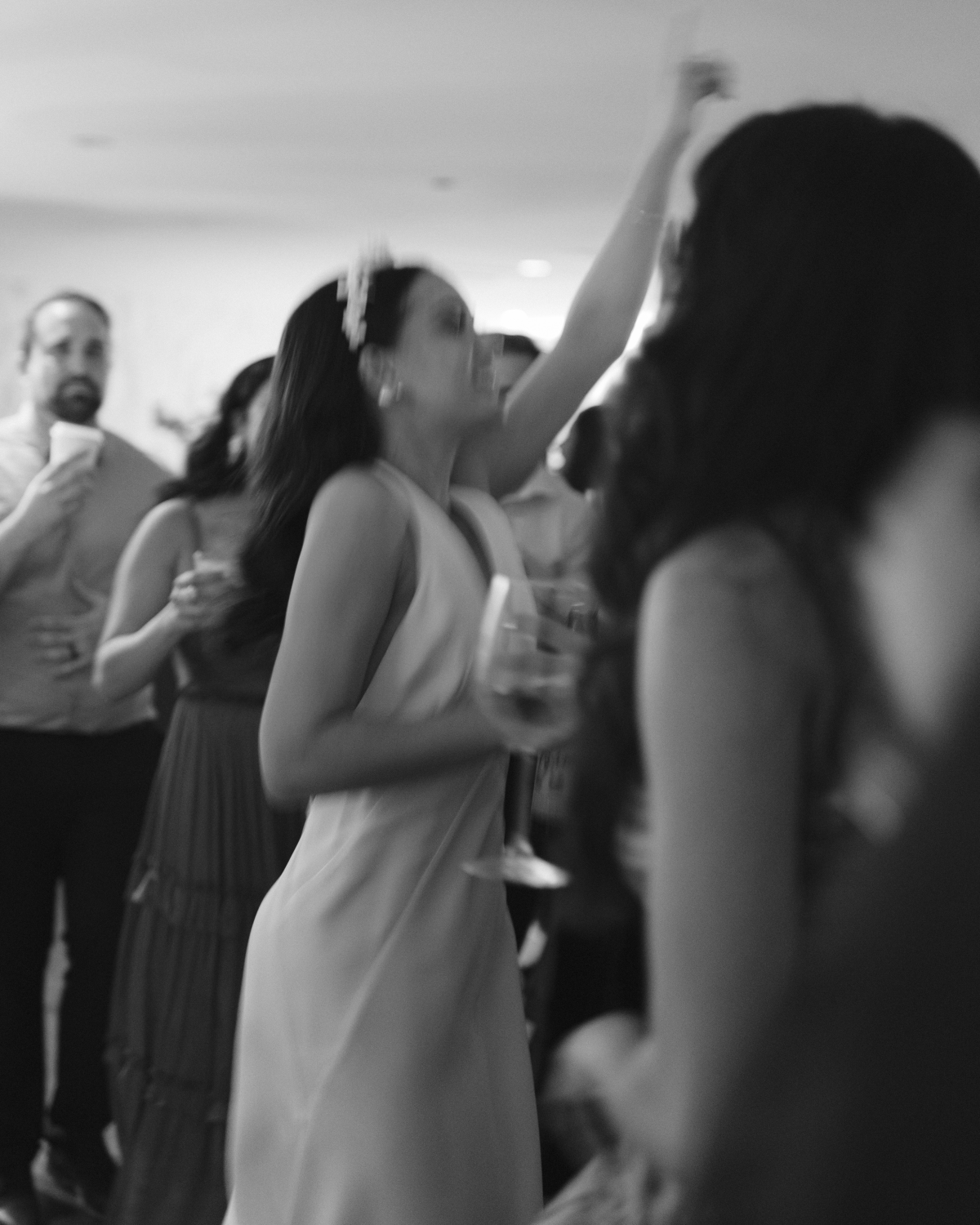 We had 175 guests. Our wedding dinner, speeches, and first dances were in the Mayfair’s ballroom, which we worked to transform into an intimate (yes, even at 175 people!) dinner party with a modest opening at the center for our first dances. Between spotlight moments and meal courses, guests got up and mingled throughout the room. This organic and social atmosphere became everything we’d hoped it would be. We wanted to intrigue our guests with the seeming lack of dance floor and surprise them with what came next. As dinner ended, a three-piece Latin brass band entered the ballroom and had everyone on their feet. Greg and I led a procession across the hotel’s courtyard garden where we danced our way into a glowing lounge-style space that was a popular nightclub in the ‘80s. Here, the events of the day would culminate in the dance party of our dreams!