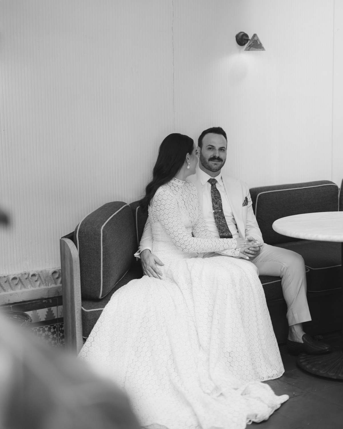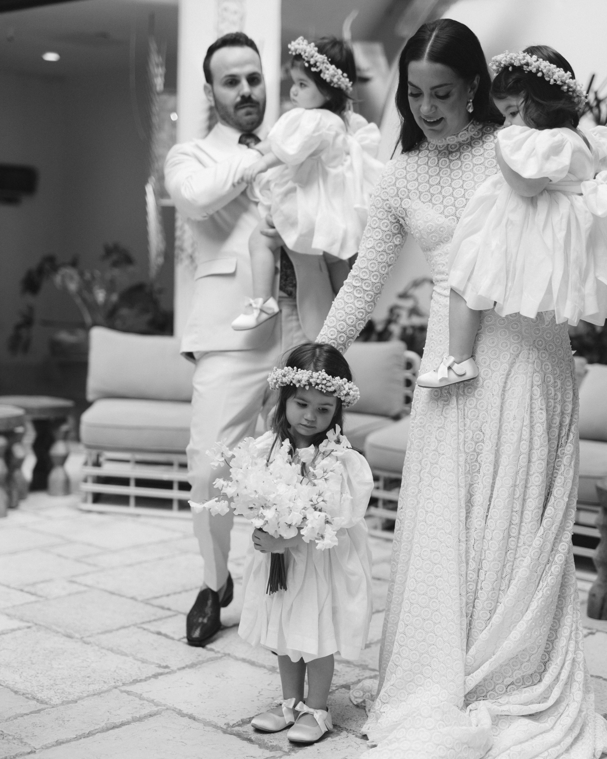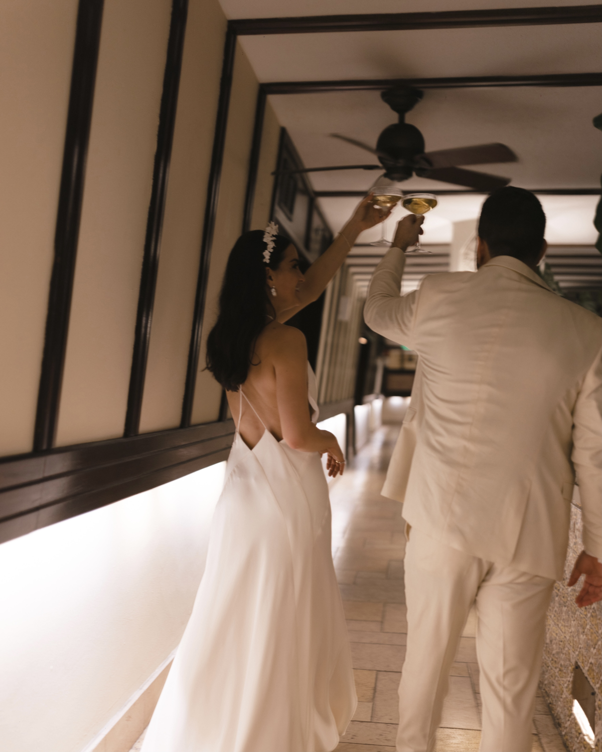 Creating our wedding looks was probably our favorite part of the planning process! I’ve worked in fashion for almost 15 years and dressing has become a really fun element in our relationship. We approached our looks through the lens of individuality, quality and sustainability. For me this meant, trying to avoid having something custom made that I would only wear once. I found the most beautiful garment I’ve ever worn at La Vie en Blanc, a luxury bridal sample sale boutique in South Miami. I purchased it off the rack after falling in love with the ivory guipure lace and drop waist silhouette in an appointment with my mom and “mother-in-love” (law). In staying true to a three-generation family tradition that began with my maternal grandmother (shout out, Abuela!) my mother and I hand embroidered thousands of tiny pearl beads from collar to hem. For Greg, his wedding day look search meant finding a classic suit with a bit of subtle flare he could keep in his rotation forever. Greg’s suit was creamy summer wool with a broad lapel- a tribute to the birth decade of the Mayfair. This time, we shopped together and made memories while going to fittings and selecting his finishing accessories. It was the perfect representation of his style and he looked so handsome!