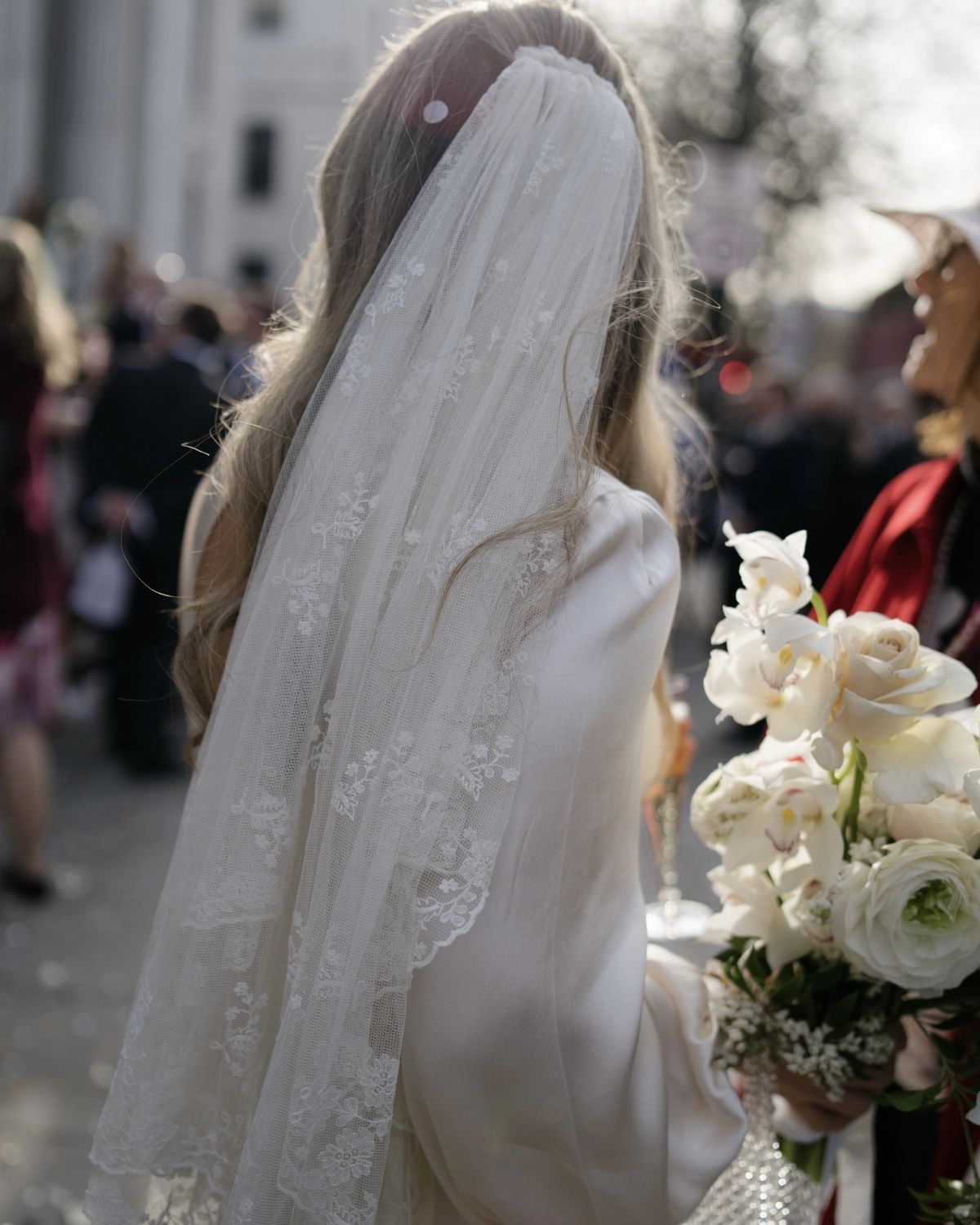 The deep cream hue of Lucy's dress ended up being a perfect match for her veil, which was antique — it’s actually 250 years old, and has been worn by brides in her family through the centuries. It’s such a special heirloom which spent 100 years or so in New Zealand before traveling back to London 65 years ago for her Granny’s wedding. Lucy wore a sapphire 1920s bracelet that her Granny left her when she died, along with a pair of her other granny’s yellow emerald earrings. It was gorgeous to feel like they were both there in a small way, even though neither could be. She finished the look with ruched and rugged Loeffler Randall heels, and swapped her veil for a cream silk bow for the reception. After dinner, she changed into a sequin mini dress for dancing, which she tracked down second hand on Vinted.