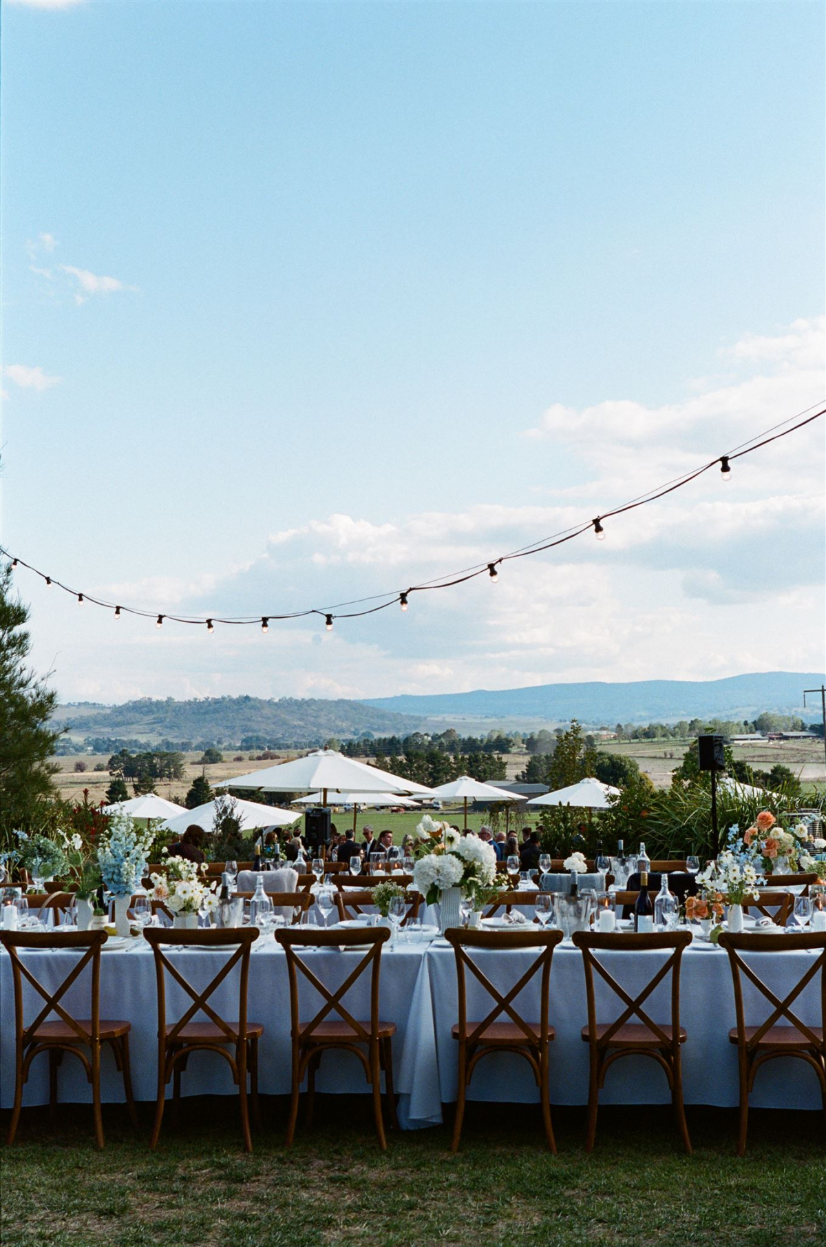 Having an outdoor reception was really important to us, we wanted our guests to relax in a natural, comfortable environment in more of an outdoor long lunch style than a formal dinner style. The terraced gardens at BoxGrove were ideal, on the lower terrace we had cane lawn furniture, white umbrellas and the bar with a grazing table full of the Central West region’s best produce and freshly baked sourdough from our caterers who also own a bakery. On the middle layer, we had a three piece band who serenaded the guests throughout cocktail hour and dinner, turning DJ in the barn at night for the party! We had our reception dinner on the upper lawn, two tables with oak cross back chairs and a head table for ourselves and our bridal party, my two sisters as maidens of honor and Brock’s brother and childhood best friend as his best men.