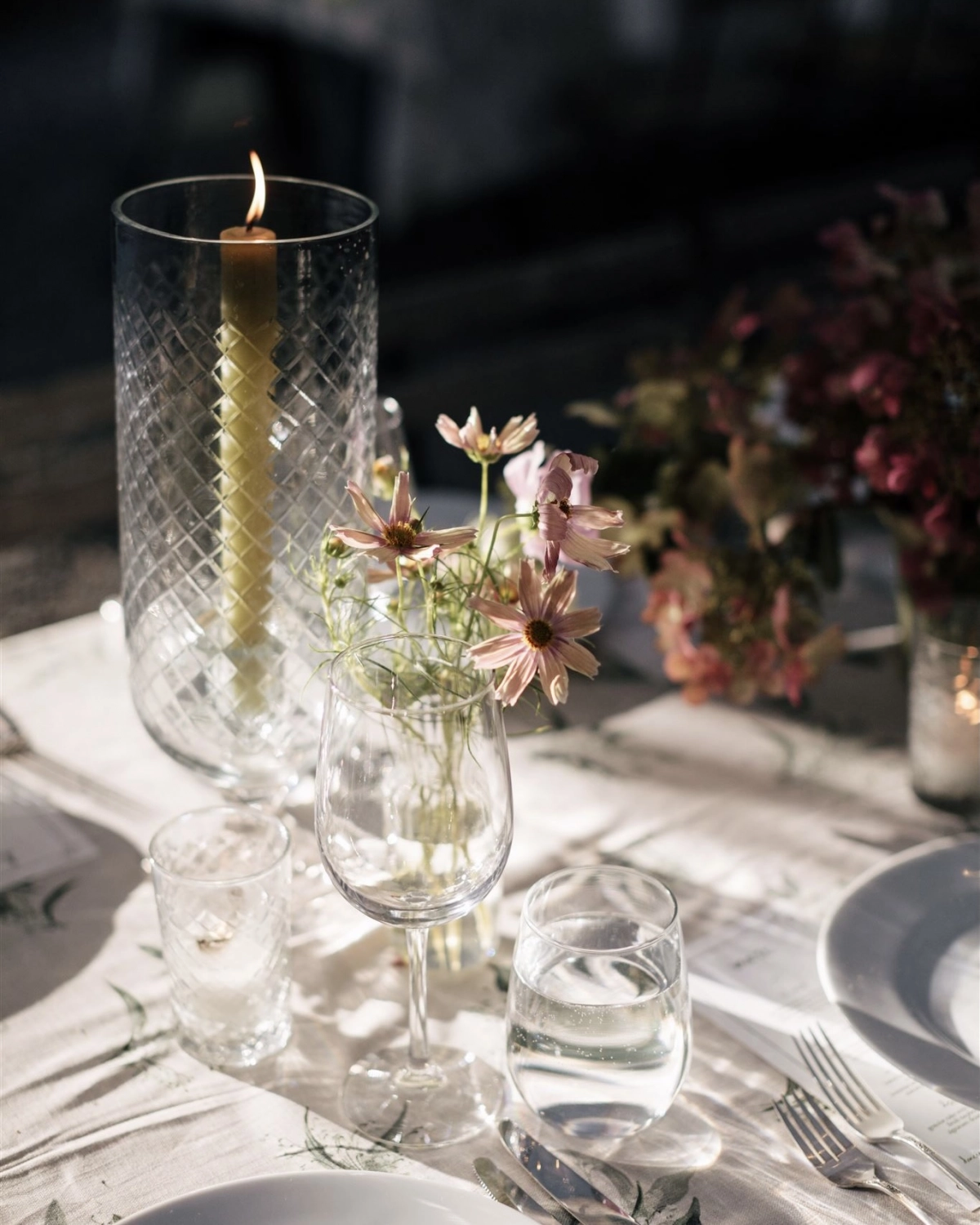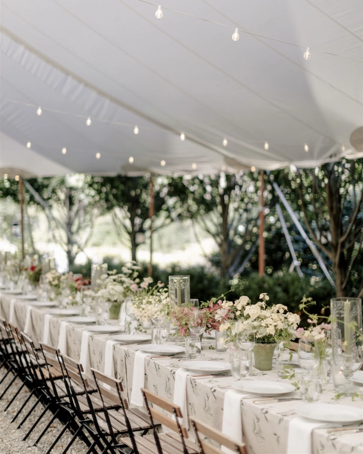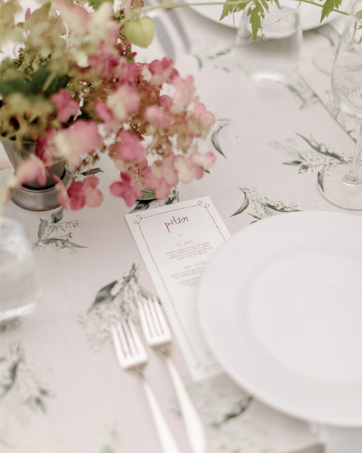 One of the perks of having worked in the wedding industry is that the options to tap into from your experience are endless… and one of the negatives is that the options to tap into are endless! For the concept, we were set on al fresco dining, an overall effortlessness, the warmth of summer, and of course — flowers. I used this stunning lily of the valley patterned linen as the foundation (fun fact: we repurposed these as drapes in our home after some legendary work from the dry cleaners on red wine stains — signs of a good party!). Shades of greens, apricot, soft yellow, and blush worked so well with the softness of the pattern and the floral season. I’ve had my eye on these mossed terracotta urns for years and paired them with etched glass and silver julep cups to vary texture. It was so fun to see everything come to life on the big day and was perfection for us.