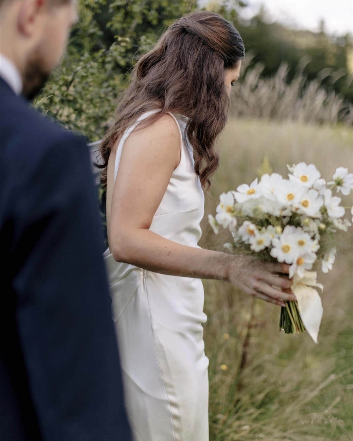 With some custom ordering timeline-related nerves, I ended up selecting a crepe Amsale gown with Chantilly lace. And then about two days later, I had a sinking gut feeling that I couldn’t shake. Somehow, my internet stars aligned and I found some gorgeous Danielle Frankel ready-made gowns on Net-a-Porter and MyTheresa. There’s an effortlessness to her gowns and everything she does is perfection, but this cowl-neck, silk antique white gown felt so me as soon as it arrived. Surprisingly, trying it on in my living room by myself also felt fitting — it was a special moment in its own right.