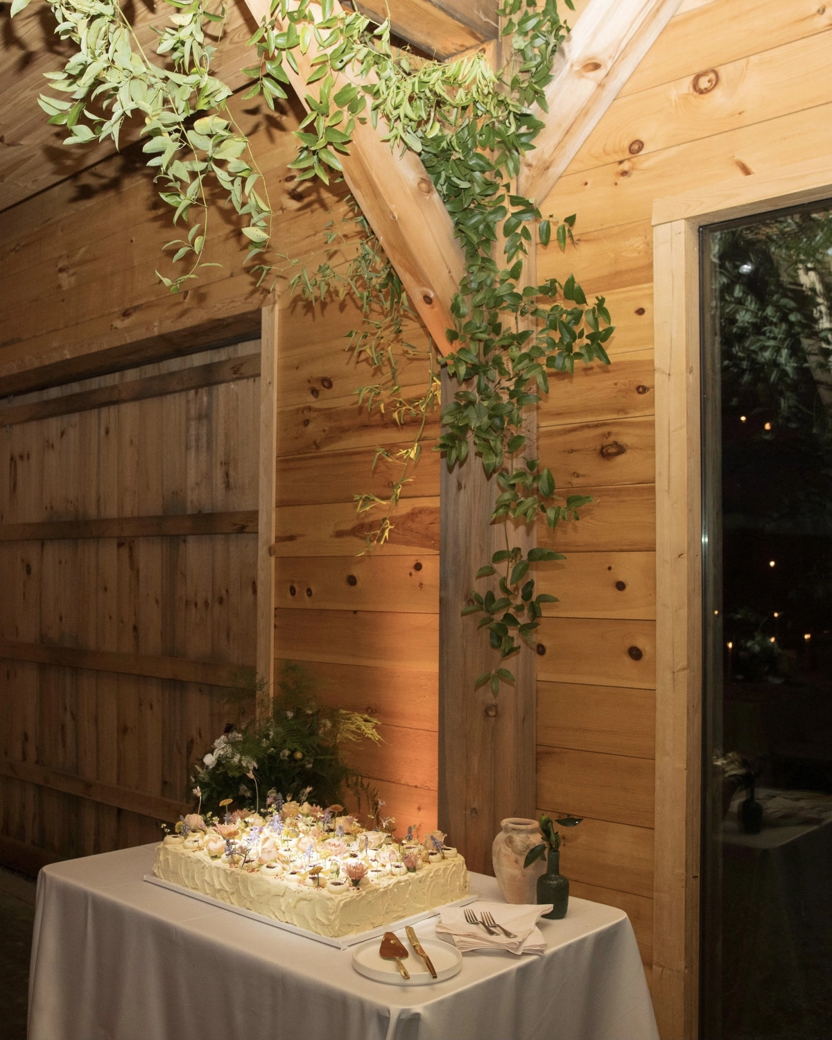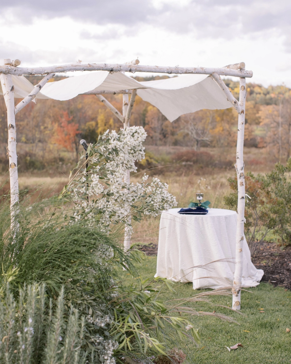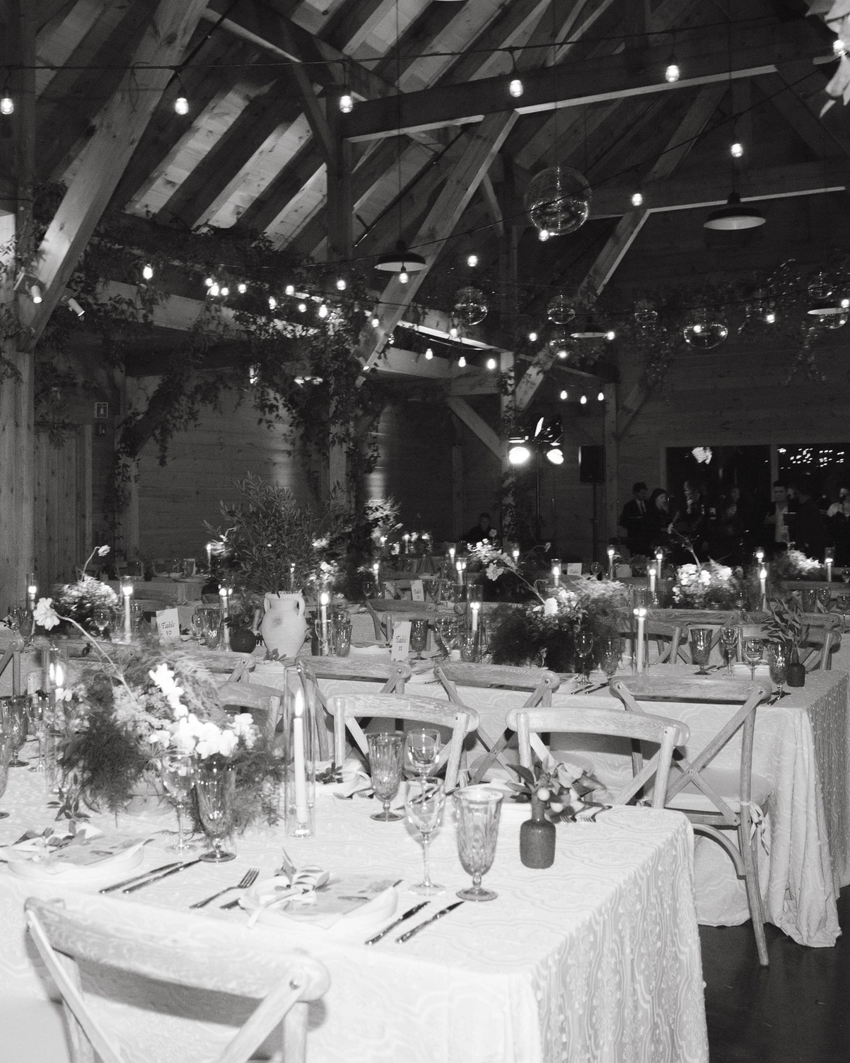 We really wanted to lean into the upstate/fall vibe of Inness and keep things intimate and warm. I grew up with a big extended family and some of my fondest memories are when we all got together over these really amazing outdoor barbecue dinners. When we found Sarah Glover/Wild Kitchen Global's open fire cooking, it felt like the perfect way to recreate (for a larger group) the warmth of a delicious, home-cooked family dinner that we both love so much. And Saturday night we wanted to keep relaxed but, above all, fun. We did our ceremony outside and then had a casual family-style dinner followed by dancing (and an after party in Inness' Farmhouse that felt like a great college house party). While Friday night was super heavy on the upstate theme, we made Saturday a little bit more elegant and elevated decor-wise. Molly Ford (Flowers by Ford) helped us bring this gorgeous English-garden theme to Inness for our ceremony and dinner.