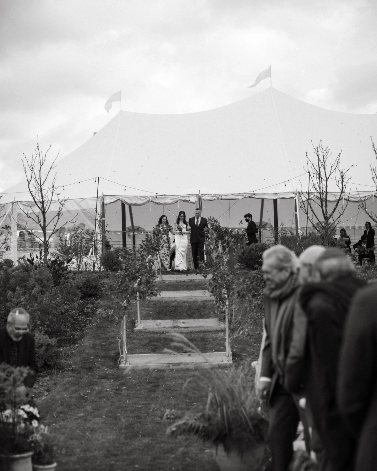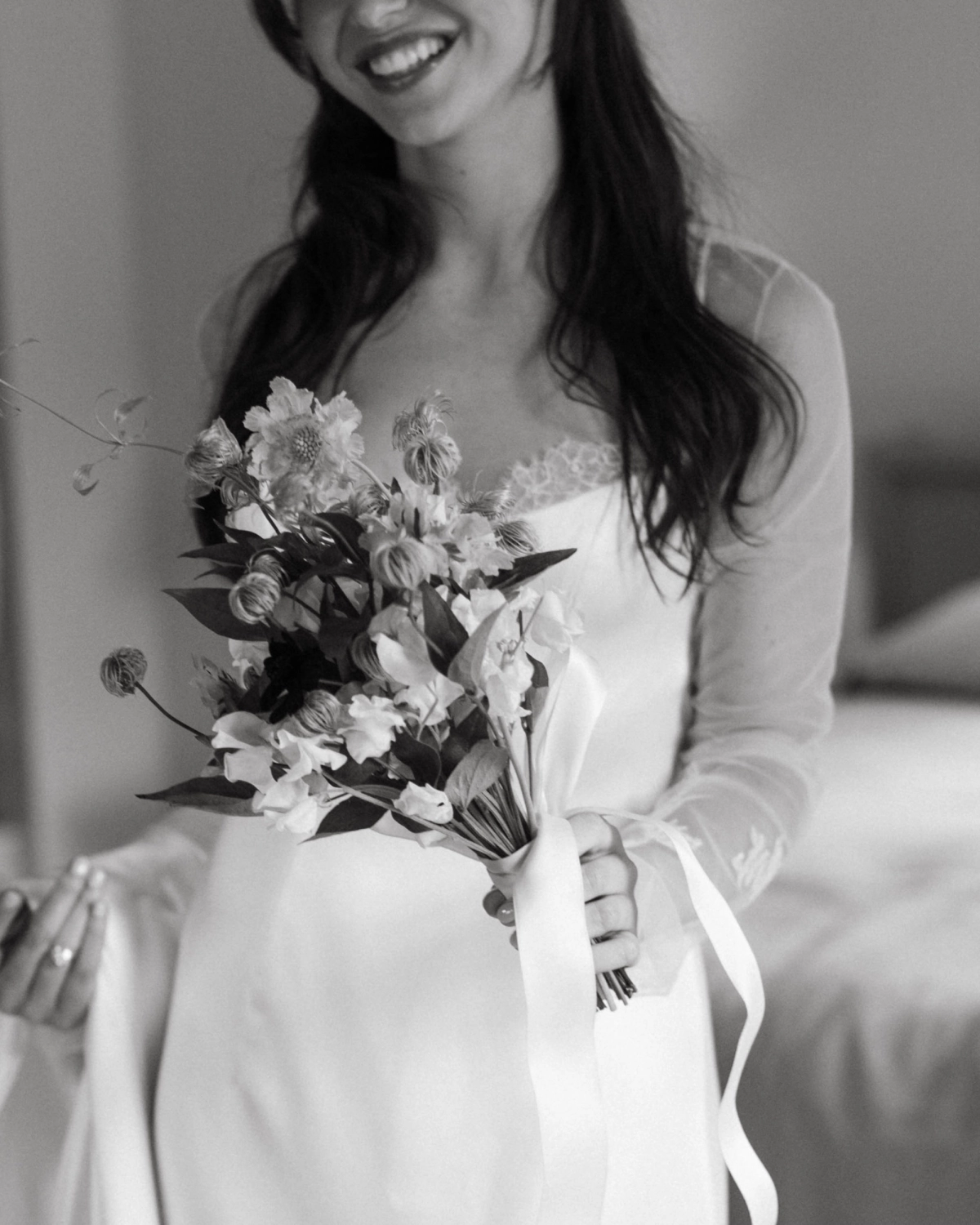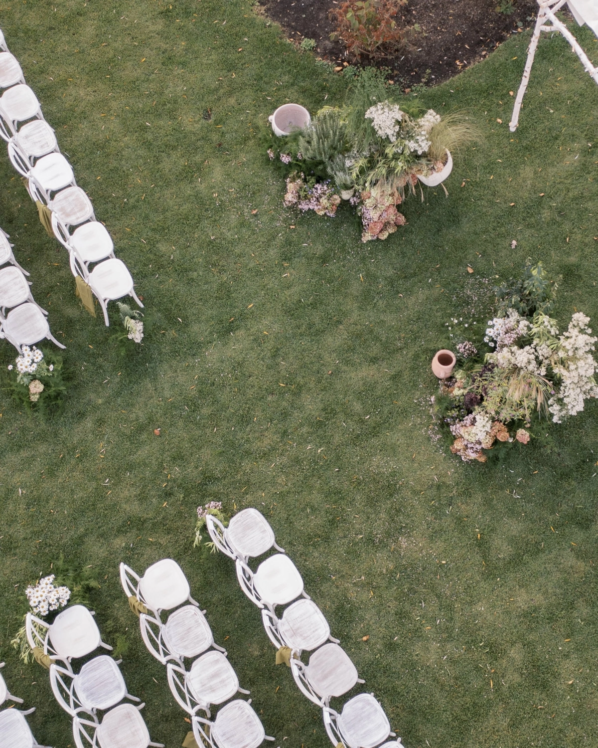 We really wanted to lean into the upstate/fall vibe of Inness and keep things intimate and warm. I grew up with a big extended family and some of my fondest memories are when we all got together over these really amazing outdoor barbecue dinners. When we found Sarah Glover/Wild Kitchen Global's open fire cooking, it felt like the perfect way to recreate (for a larger group) the warmth of a delicious, home-cooked family dinner that we both love so much. And Saturday night we wanted to keep relaxed but, above all, fun. We did our ceremony outside and then had a casual family-style dinner followed by dancing (and an after party in Inness' Farmhouse that felt like a great college house party). While Friday night was super heavy on the upstate theme, we made Saturday a little bit more elegant and elevated decor-wise. Molly Ford (Flowers by Ford) helped us bring this gorgeous English-garden theme to Inness for our ceremony and dinner.