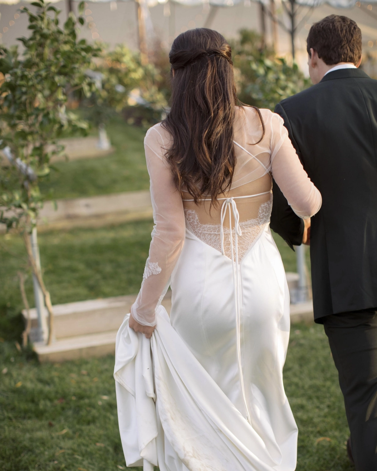 Friday night I wore a long sleeve white Chloe dress that was relaxed and had a colorful woven/fringe element (on pockets/belt). I wanted my Friday night outfit to match our dinner — cozy, comfortable, and outdoorsy. It was from an older Chloe collection but very classic Gabriela Hearst style. My wedding dress was Ines Di Santo. I never knew what I wanted for my wedding dress but I knew I wanted to feel like myself and that a big skirt was never going to be for me; I loved that my dress was very simple and classic! And then I changed into a two-piece Prada set; it was an off-white with black lace detail. I thought it was fun to bring a little bit of black into the wedding wardrobe and I think I'll rewear that set forever — I already wore it in on my honeymoon.