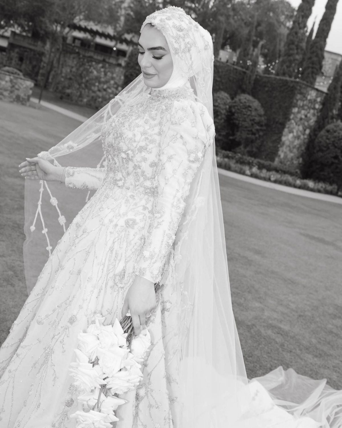 Oh I tried a lot of styles! I always had a feeling that I needed a custom made dress because I am extremely particular about which silhouettes flatter my body. I also knew exactly which silhouette matches my body type but I still tried all types of gowns and I’m happy I did. After trying so many, I knew I needed something A-line and modest which was very challenging to find in the US. I ended up going to the Middle East to customize my wedding dress from scratch! That was another adventure to tackle but looking back I’m so happy I did that. A lot of the heavy work was in my bodice. My entire bodice was hand beaded and each piece of the pattern was slightly different. Of course no one can see that asymmetry but that’s what made me love it even more.