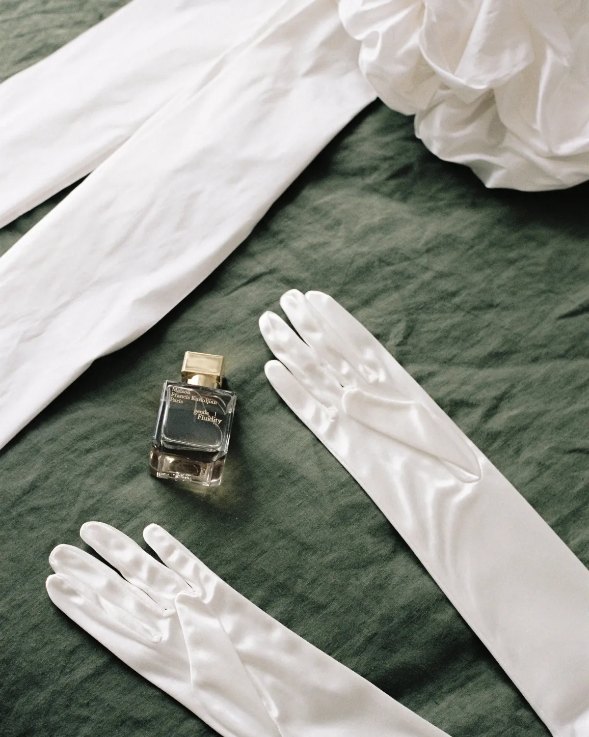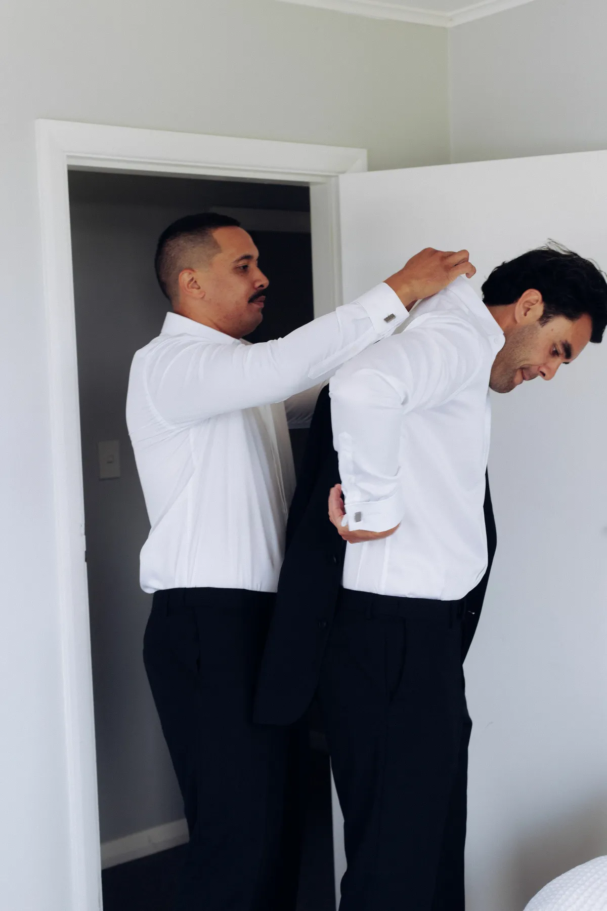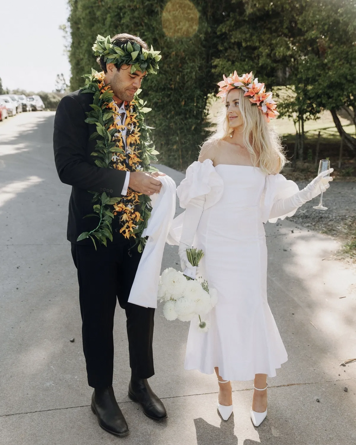 I initially had visions of wearing blue but decided a pop of bright white amongst all the colors would be perfect. Particularly next to the girls in their bold colors. Mine started with a simple silhouette. I wanted something structured and reasonably casual, so decided pretty early on to go with a shorter length. The gloves and train puffs were a late addition, and not something I ever thought I would go for! But I liked the drama it added. Later in the night, I wore the dress on its own as a second, more relaxed outfit. Cruise wore a classic black suit with his usual cool and edgy spin on it. We went from shop to shop trying to find a white shirt with covered buttons for a minimal look and decided against no tie or bow tie to keep it slick. We both wore traditional garlands throughout the day, which were made by Cruise’s mum.