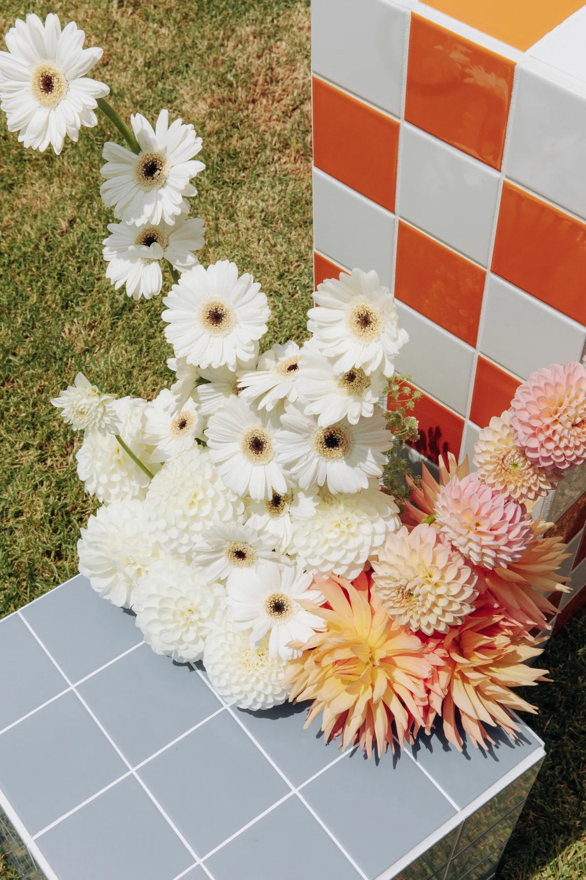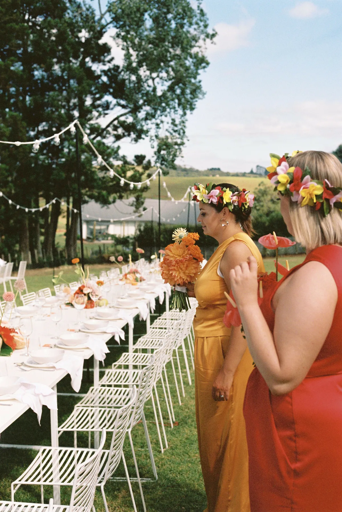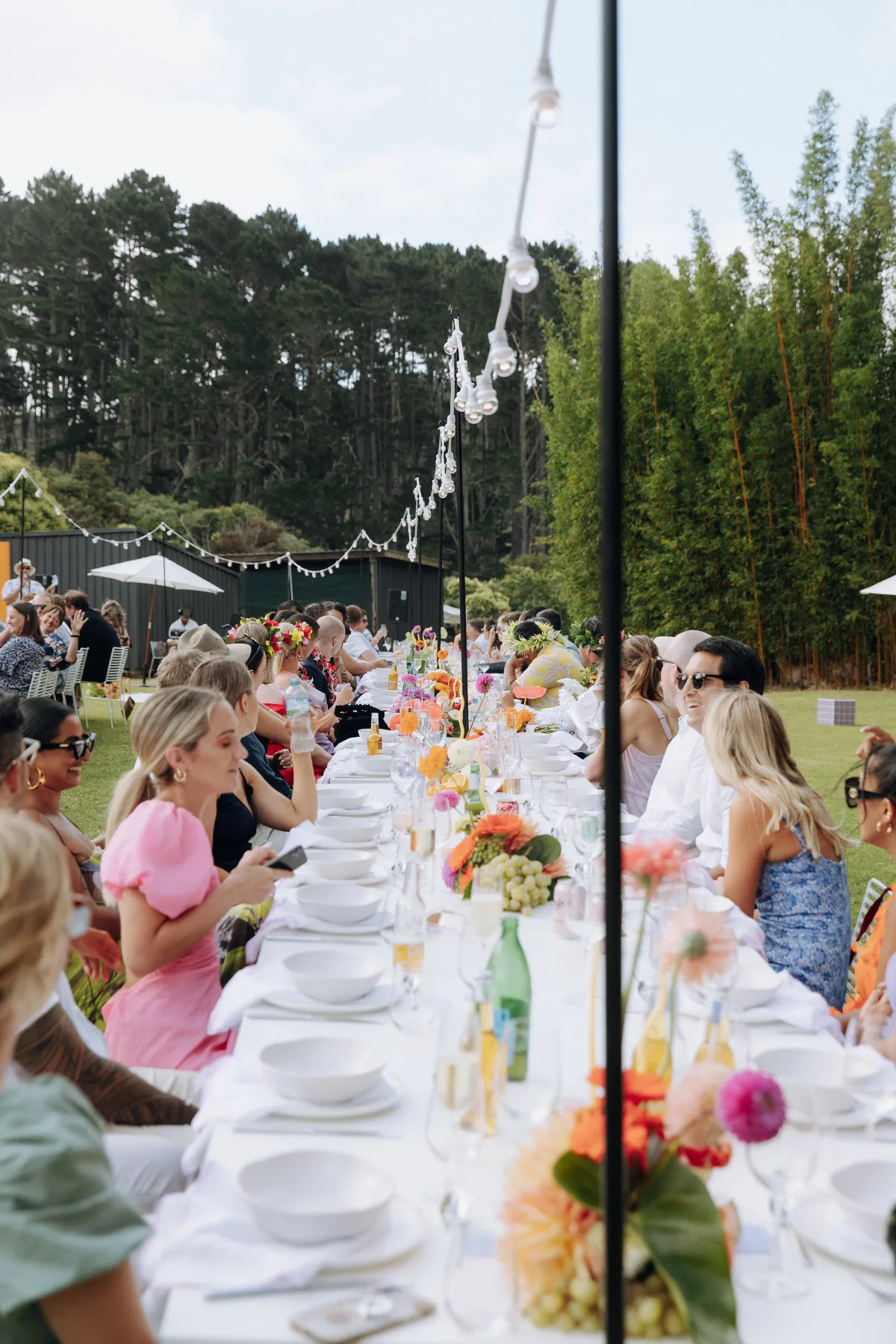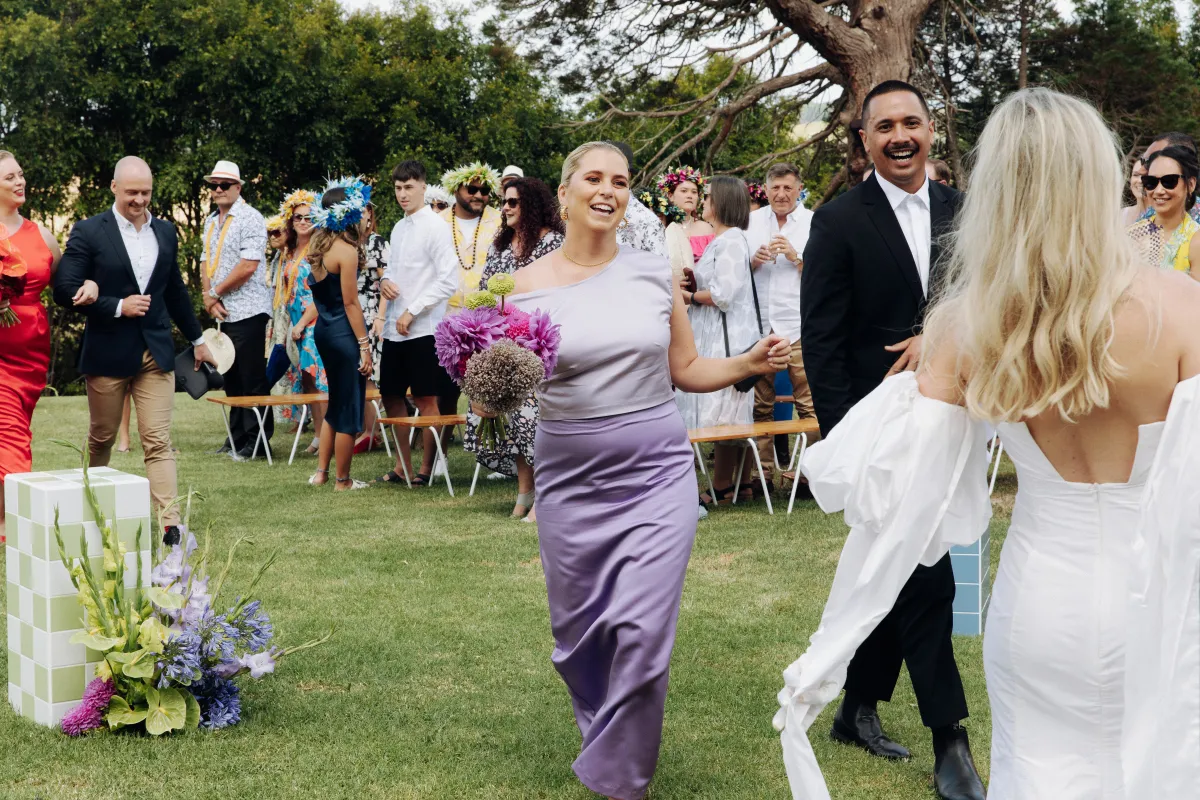 The concept for our wedding started with Cruise’s Niuean & Cook Island heritage, which was a big part of our day. We wanted to embrace the culture and go bold with our color and floral choices. I convinced Cruise to ditch the marquee (with no plan B for rain!) and create an alfresco dining experience for our guests, and luckily for me, the weather pulled through. We wanted to create a fun outdoor space, something fresh and a little different from the norm. The addition of fruit on the tables fit the theme perfectly. I spent months making the checkered tiled boxes and plinths to add some more color, and Cruise (with some help) made our freestanding colored walls, which made for great photo backdrops. We tried to steer away from the typical wedding traditions and focus more on making it a fun, relaxing day for our guests. Starting with a mojito (or three) at the entrance.
