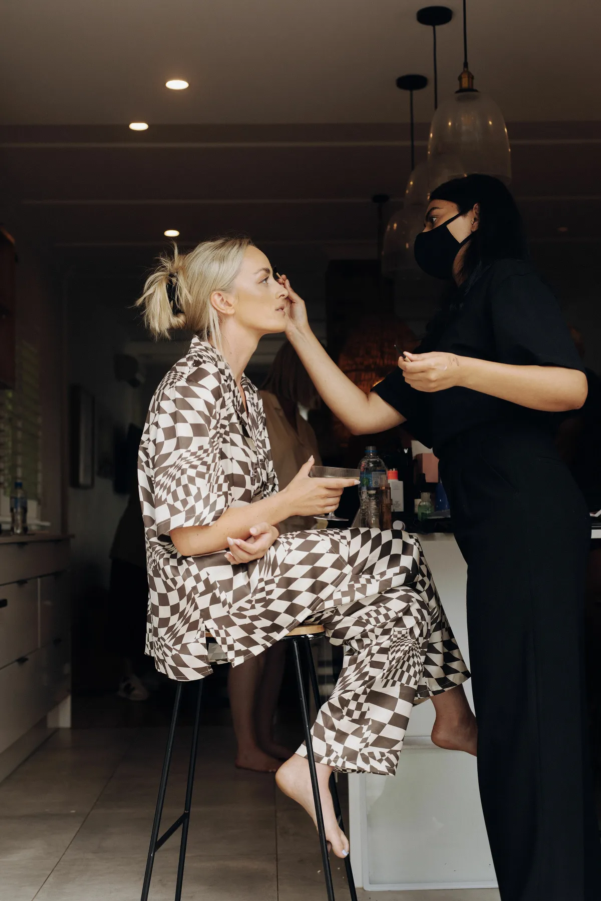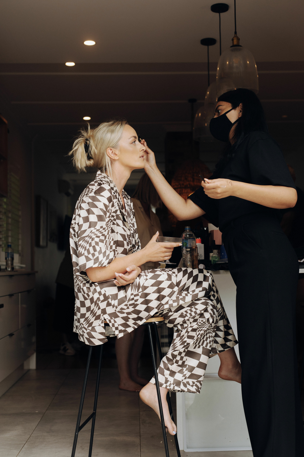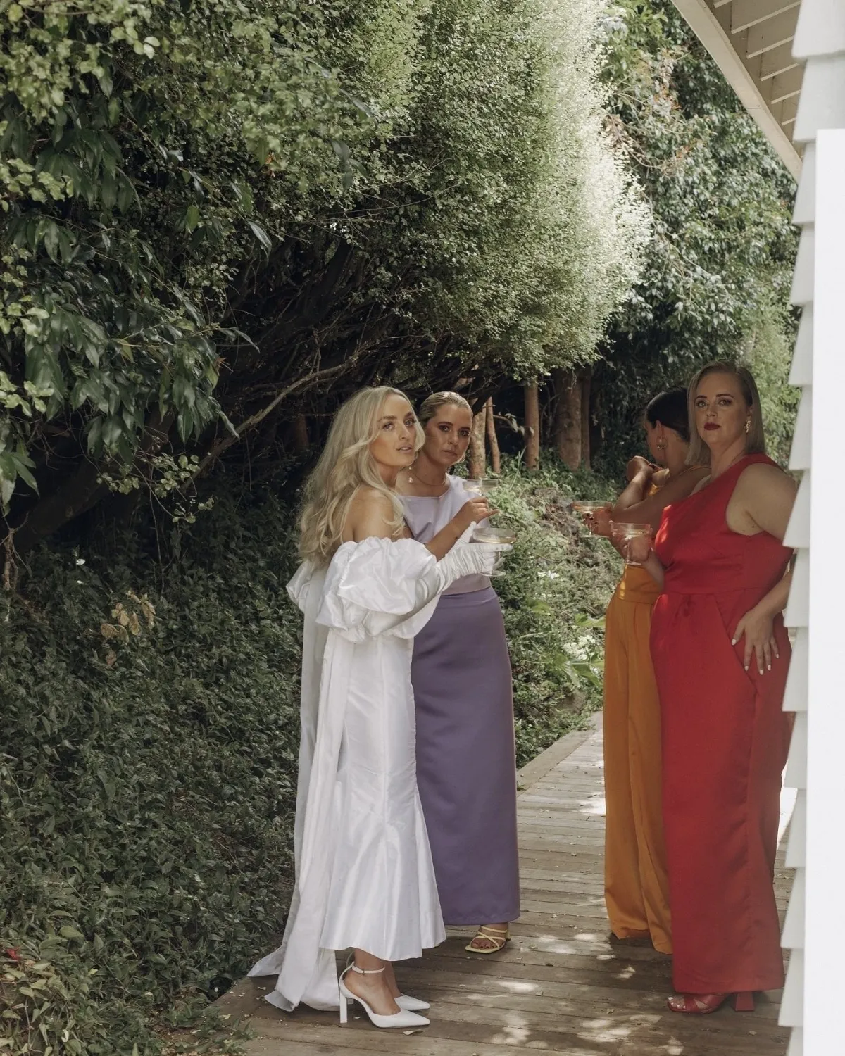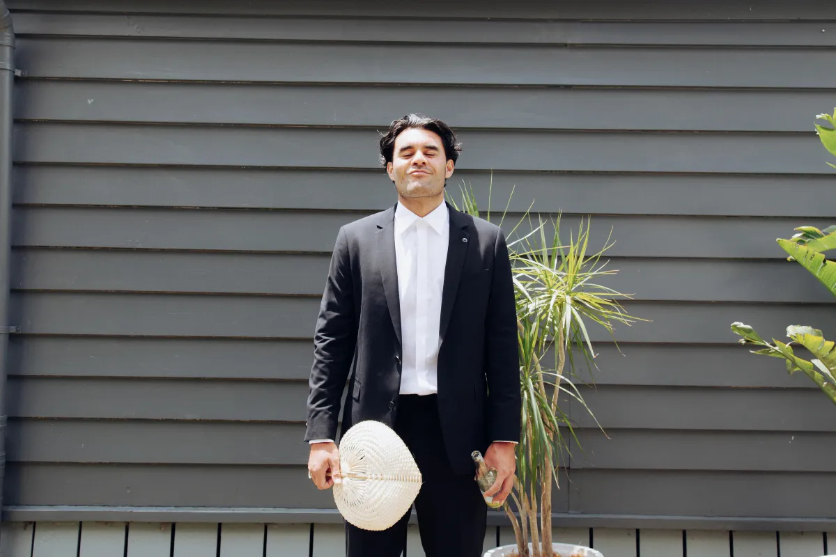 The concept for our wedding started with Cruise’s Niuean & Cook Island heritage, which was a big part of our day. We wanted to embrace the culture and go bold with our color and floral choices. I convinced Cruise to ditch the marquee (with no plan B for rain!) and create an alfresco dining experience for our guests, and luckily for me, the weather pulled through. We wanted to create a fun outdoor space, something fresh and a little different from the norm. The addition of fruit on the tables fit the theme perfectly. I spent months making the checkered tiled boxes and plinths to add some more color, and Cruise (with some help) made our freestanding colored walls, which made for great photo backdrops. We tried to steer away from the typical wedding traditions and focus more on making it a fun, relaxing day for our guests. Starting with a mojito (or three) at the entrance.