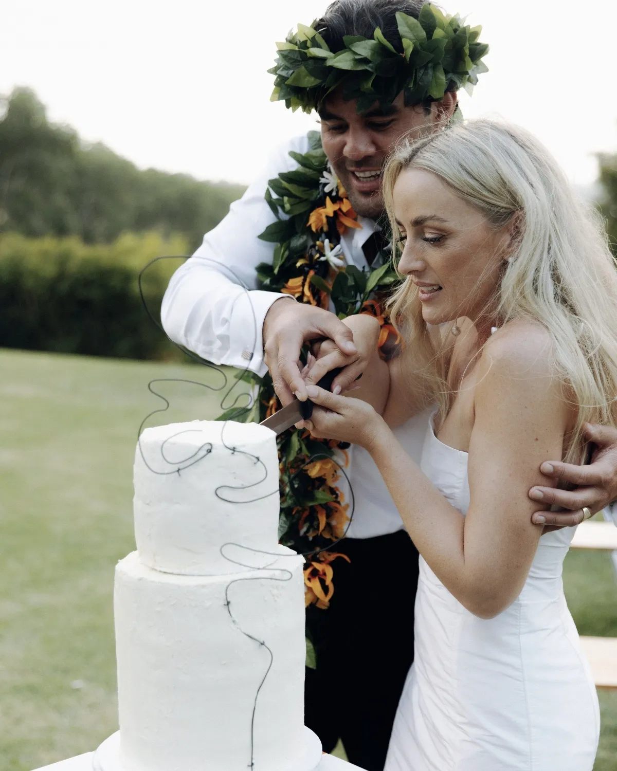 My mum is an amazing baker, so we were lucky enough to have her make the cake for us. It was perfectly simple, two tiers, lemon syrup cake on the bottom and banana and dark chocolate on the top - Cruise’s favorite. The cake was then covered in a white chocolate whipped ganache. I found a cake on my Pinterest travels in the early stages of planning with an abstract-looking wire sculpture attached to it and did my best to replicate it. Cake but make it art!