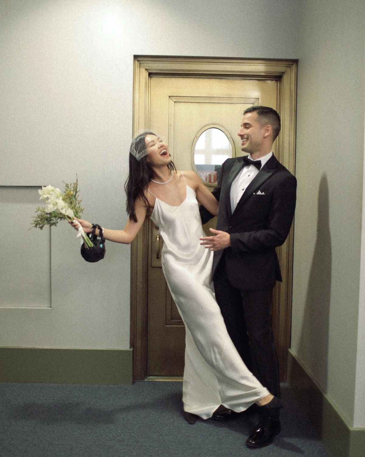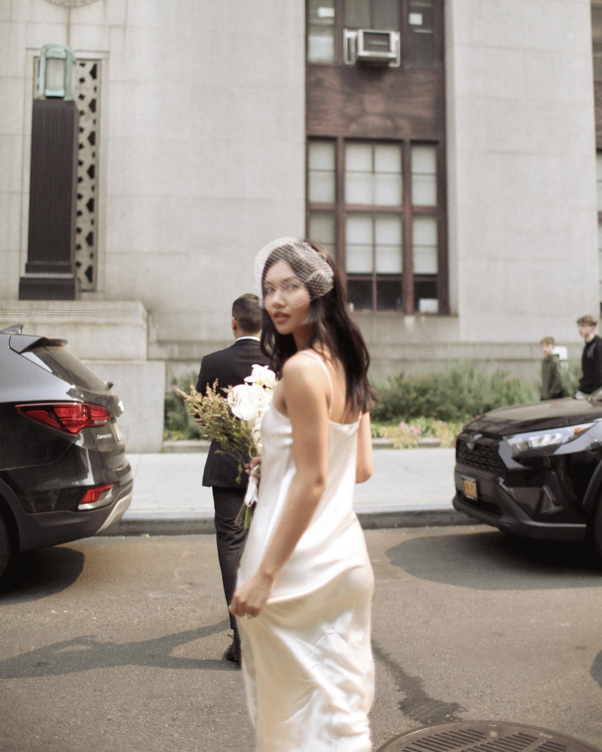 Kelvin got fitted at The Black Tux, he had purchased a few suits from there in the past and always loved the fit and service, so he went with a very classic black tux. I tried on maybe 8 dresses in total? From Staud to Khaite — I really wanted to avoid traditional bridal dresses. I ended up going to Nili Lotan in Tribeca and purchasing a beautiful silk slip dress which paired perfectly with a headpiece from Jennifer Behr their team gifted me.
