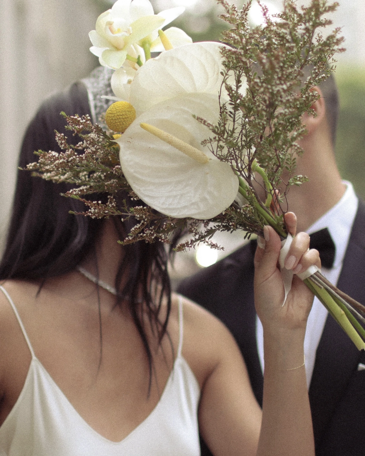 Concept was minimal, classic, and practical. I’ve always loved pinning weddings on Pinterest, so I was able to look through my wedding board and pulled some inspiration from there. When I say practical, I was able to decorate my dinner table at Vinegar Hill House with beautiful glass cups and vases we already owned and brought flowers that I received from a few brands just days before the wedding and I reused them as our center pieces along with my wedding bouquet that I designed (shoutout to Merit for the stunning anthurium bouquet).