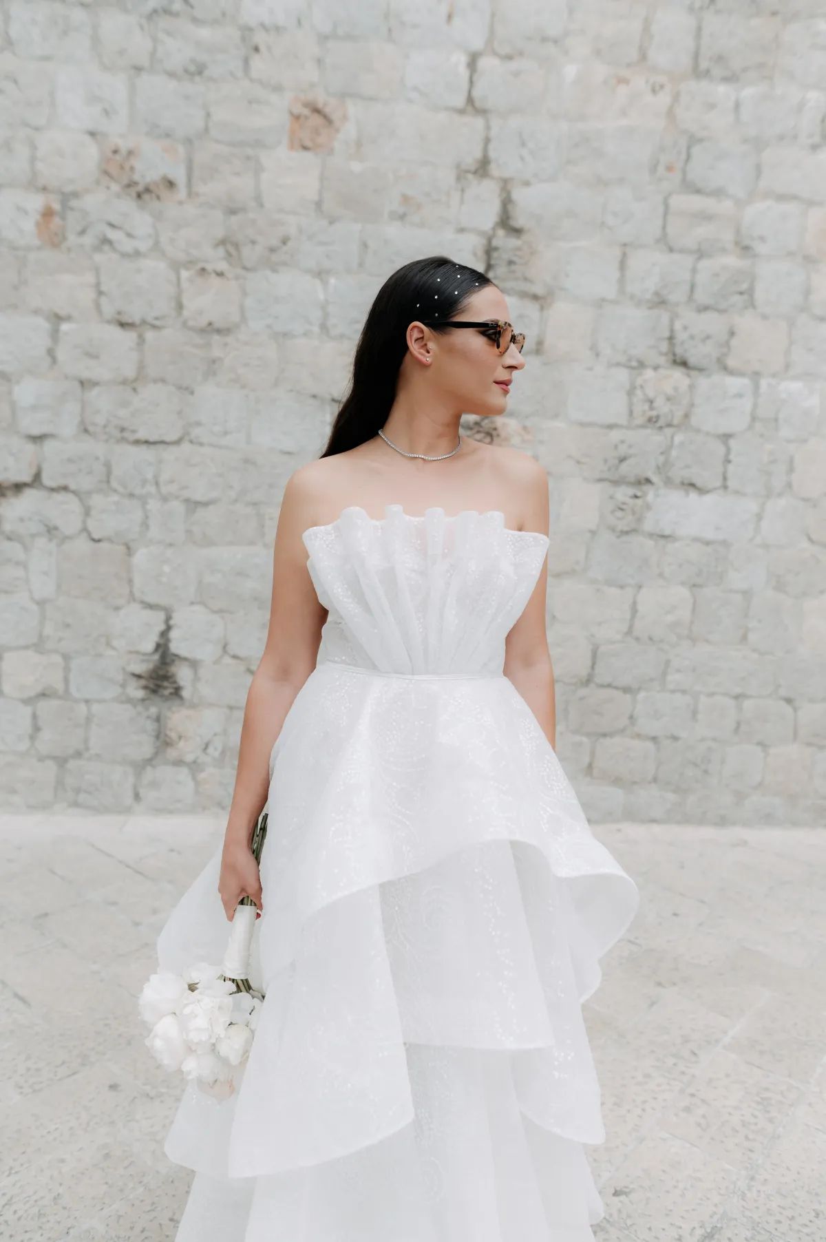 My first choice for a wedding dress was Alex Perry, but it was very complicated to arrange a fitting because I live in Dubrovnik. So, I was looking for something similar that was more accessible. I found the dress from a Croatian designer Envy Room and the shoes were Jimmy Choo. Toni found everything for his outfit at Pal Zileri.