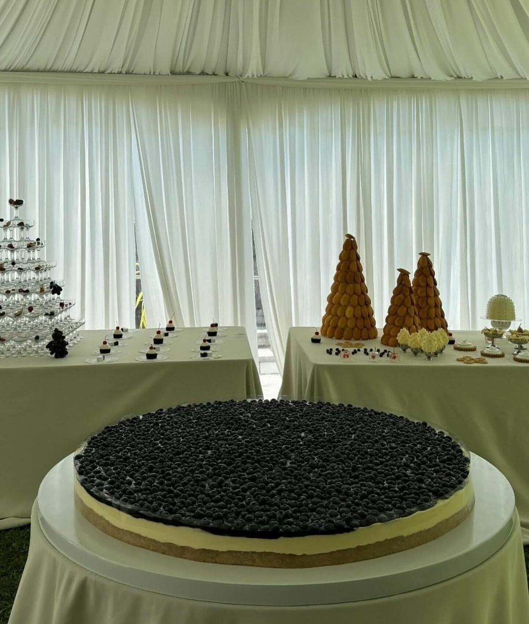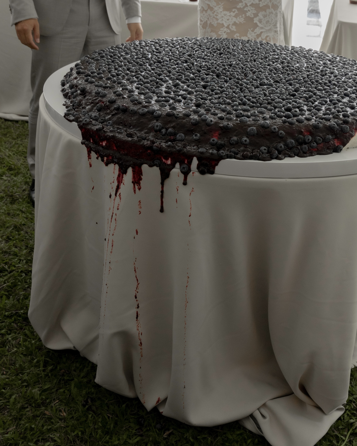 I mostly find references and inspiration online, Pinterest, different Instagram accounts: The Wed of course being one of the most important source for my inspiration. I’ve been saving images online for references over time, some of which aren’t necessarily related to weddings, but holds the moods and visuals that I like and compile them to make mood boards. Grid and I didn't have a clear vision when we began planning our ceremony, but one thing we were both firm about was ensuring that our family and friends could enjoy the day and feel at ease throughout. Our aim was to create a cozy and laid-back atmosphere. One of the first things I thought about was the cake. While cakes aren't traditionally part of Thai engagement and wedding ceremonies, but, I wanted to implement it on our day. I wanted to create something special for everyone to really enjoy, rather than having cakes and desserts merely as decorations. That's why I decided to go with my husband's favourite dessert: the Blueberry Cheese Pie, which turned out to be 1 meter long in diameter.
