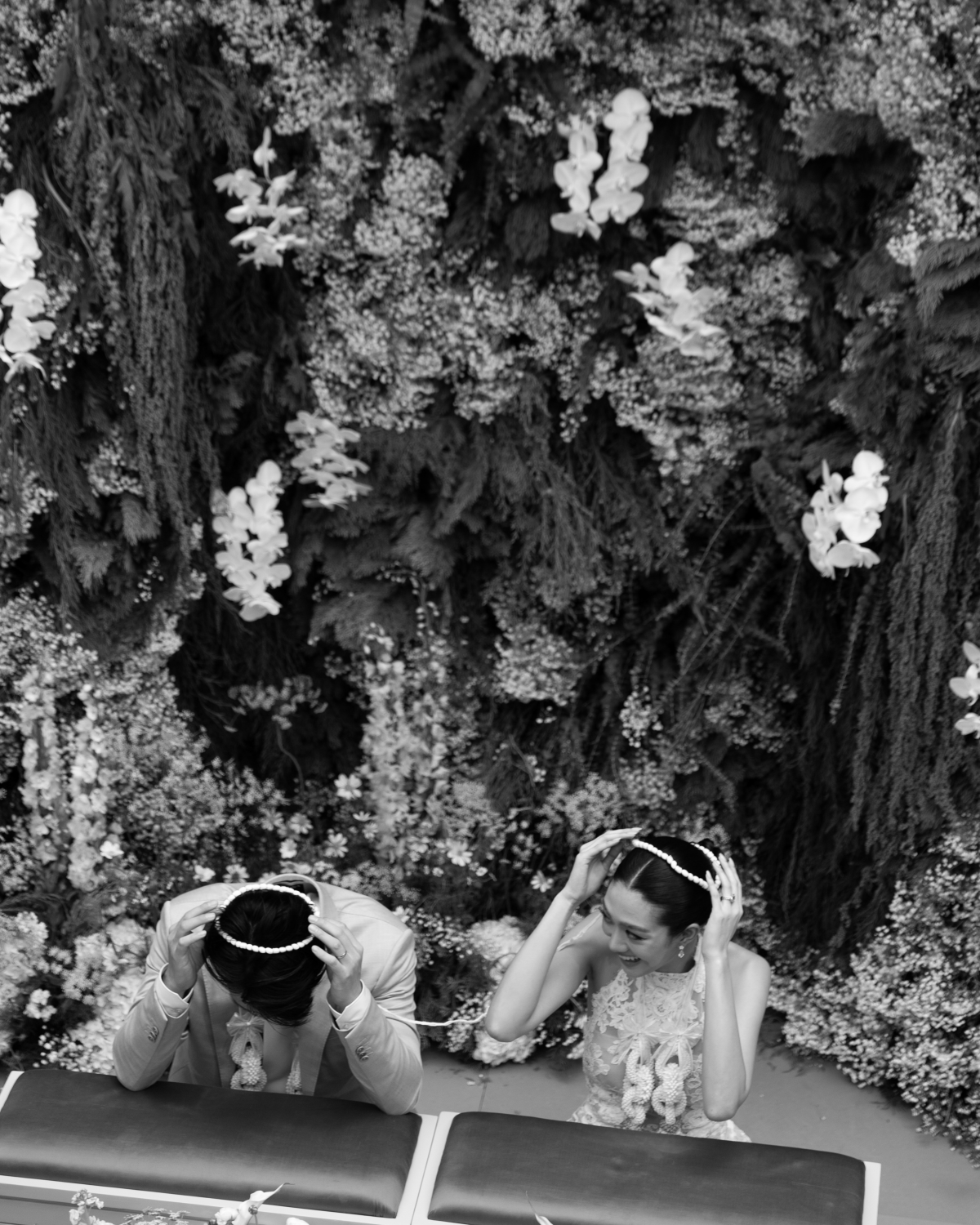 I tried on over 40 styles of dresses from multiple brands but at the back of my mind, I’ve always had my heart set on wearing an Oscar de la Renta wedding dress. However, as I didn't quite plan ahead of time, I didn’t have the opportunity to try on the dress before deciding on it. In fact, it was my wedding planner, Keng, and my maid of honour, Kem Issara, who said ‘yes to the dress for me’. Keng saw a picture of the dress and said that this was the one. I then sent the image to Kem, who coincidentally had tried on that dress 2 months prior, as she was also getting married. She told me that this was the dress I had to wear. I also wore a white Traditional Thai Dress (made from Thai Silk made in the North of Thailand) for my morning ceremony before changing to the Oscar de la Renta dress for the exchange of rings. For the after-party dress, I wore a creation from Kem Issara Studio.