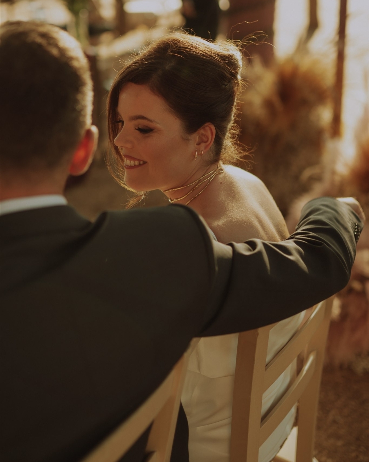 The bride wore a dress with detachable XXL sleeves in natural Italian silk that she designed together with her friend Marta and was crafted by a dressmaker from Porto. She also wore gold sandals from Zara. As jewelry, she wore the gold and diamonds engagement ring from Sansoeurs, a ring from Aristocrazy that was a gift from her friends at her bridal shower party, a choker from Caruncho and Codina, and a gold bracelet from her grandmother, who recently passed away. The groom wore a suit by Giorgio Armani, shoes by Pedro del Hierro, and a tie by Mirto.