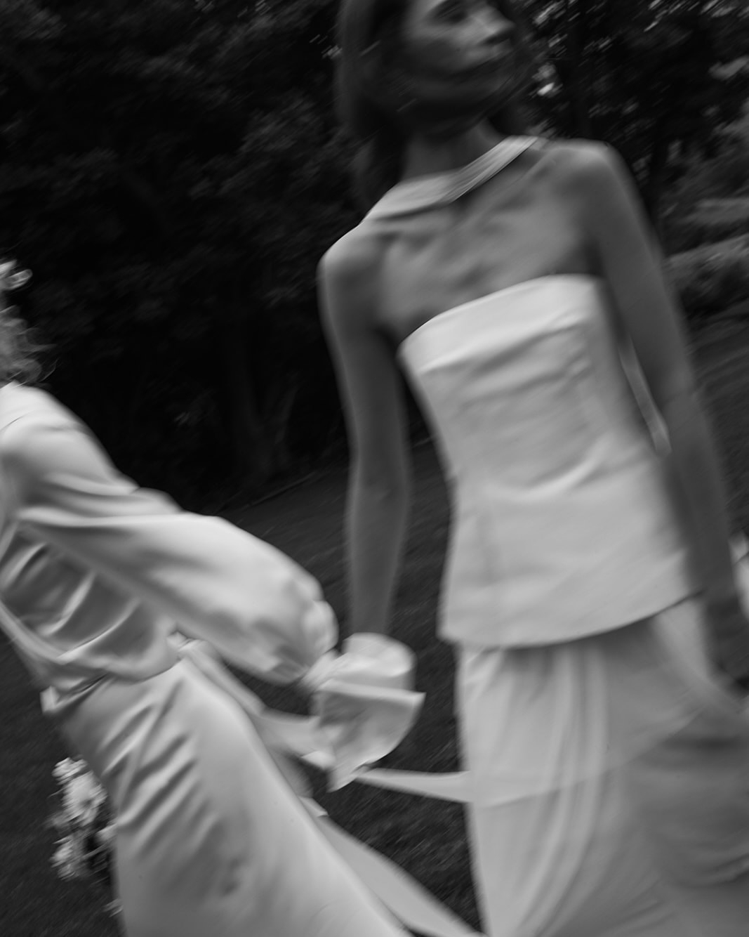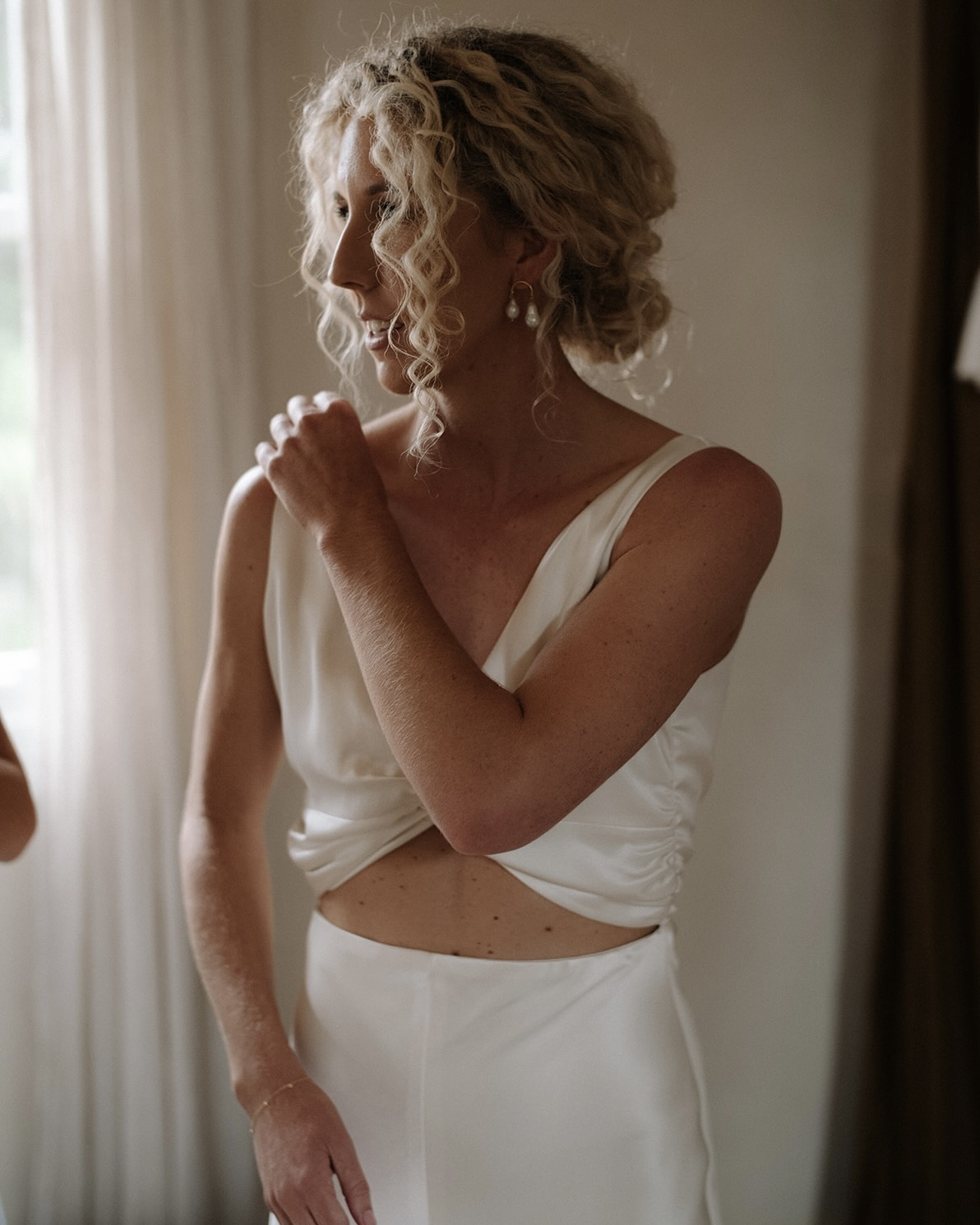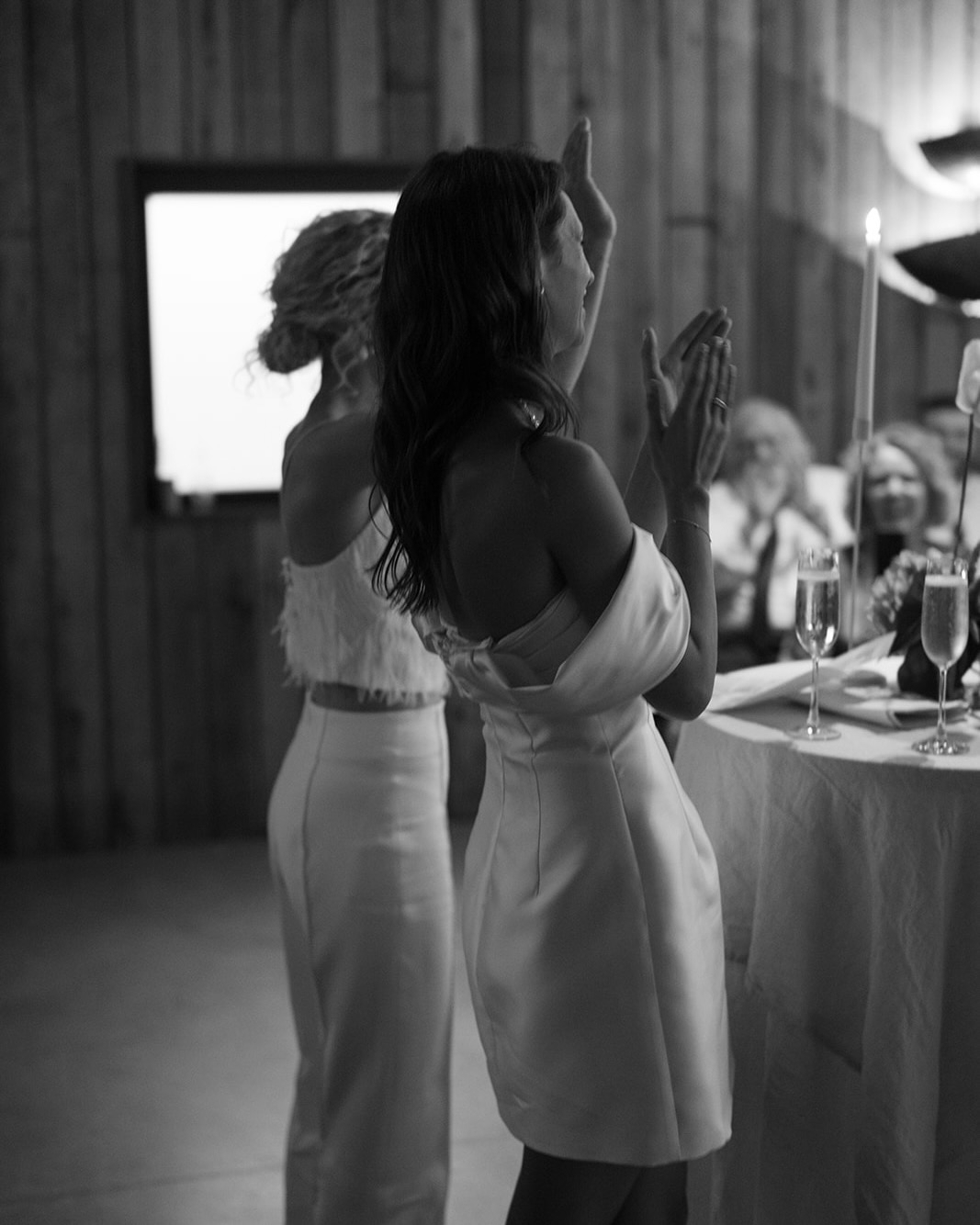 I also had my heart set on the Sidonie gown, so we decided to make the Sidonie into a little mini dress and add the sleeves from the Audra gown for my second look. This was so much fun to wear and perfect for the dance floor. Kayla chose the Brooke gown with the Cecile blouse over the top from Prea's classic collection. She has a little more of a relaxed style to me so this look suited her perfectly and so comfortable to wear. The satin silk used for the gown and blouse is so soft and luxe. Kayla got changed into the Florence feather top and Zoe pants for her second look. The feathers looked amazing in pictures and added such a fun element.