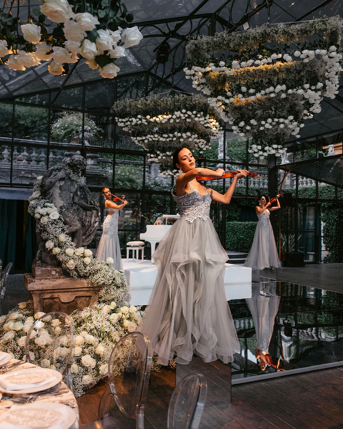 Our concept was elegant classical with romantic allure from the white and grey color palate and white Dior fabric with statues draped in white roses and orchids, transporting guests back to a romantic era.