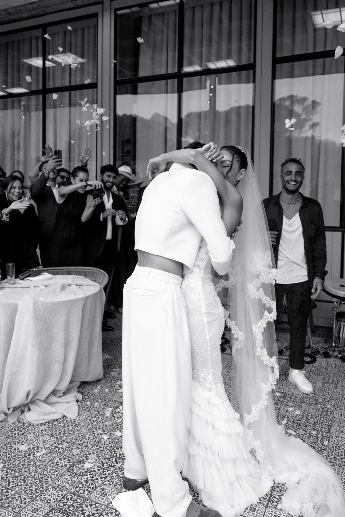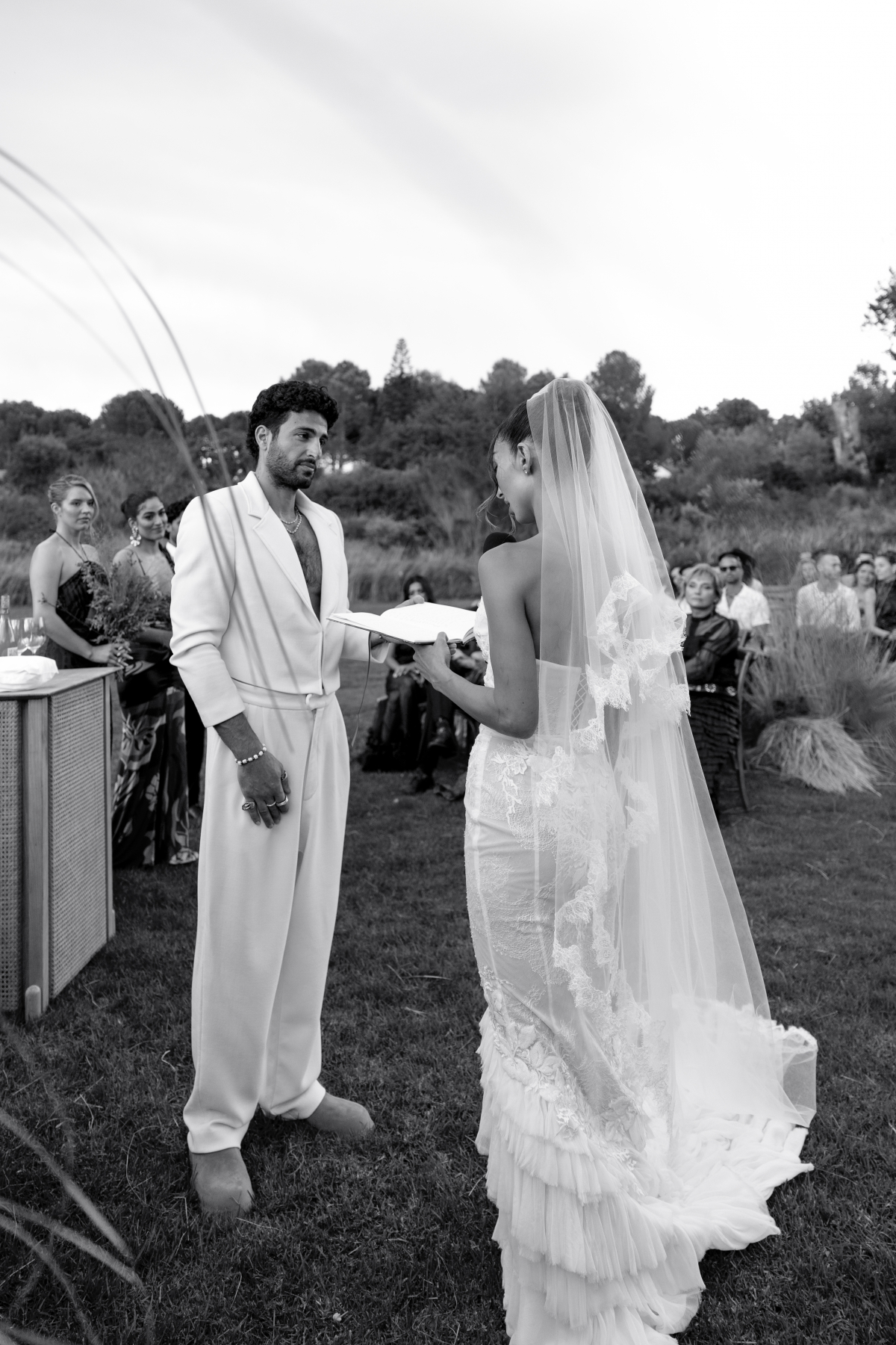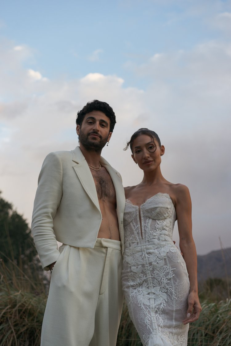 Wedding Day. Xanika wore a custom gown and veil by Kim Kassas Couture and Aquazzura shoes. Jeff wore a custom suit designed by Bo Metz, an LA-based designer and good friend, and Jacquemus shoes. Rehearsal Dinner. Xanika wore a corset top by MANURI and a skirt by Fleur Du Mal. Jeff wore Amiri pants and a vintage Givenchy blazer from The RealReal. Other Notable Designers. We both wore Jacquemus and Dion Lee a lot throughout the week, but our favorite look was Xanika’s yacht day dress by Brazilian designer and friend Andrea Almeida!
