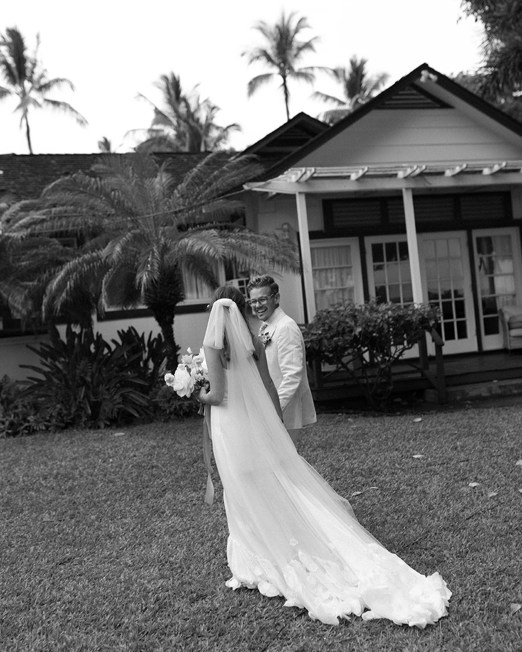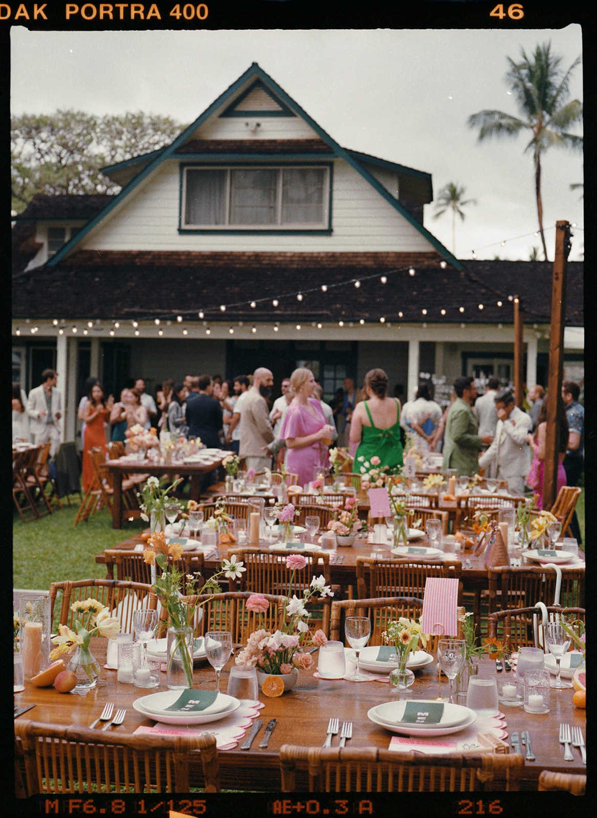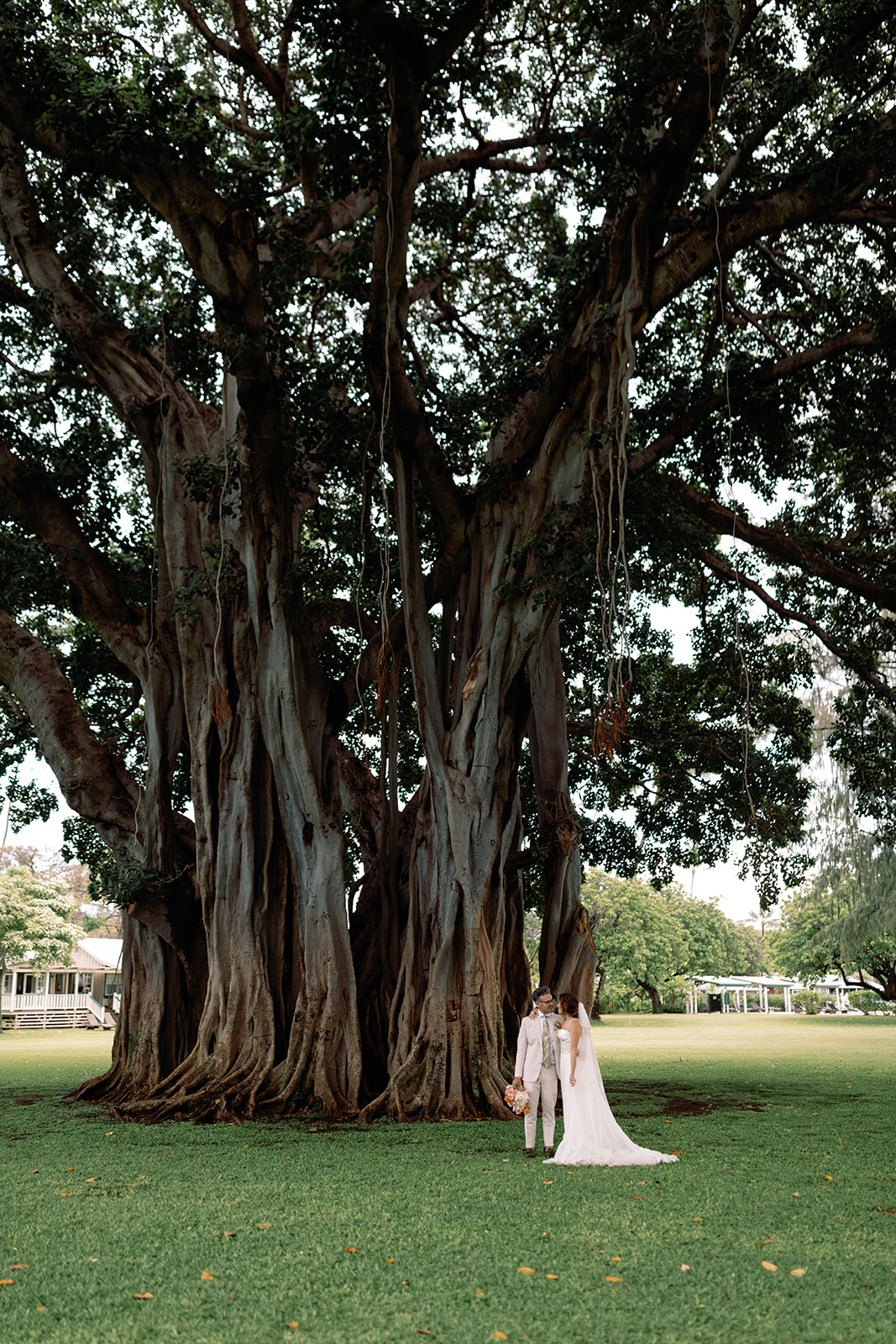 It was held at Waimea Plantation Cottages in Kauai. We're both from the West Coast, and we were drawn to tropical landscapes, which led us to Kauai. We wanted a venue that felt like a "tropical summer camp," intimate enough to interact with all our guests and play nostalgic lawn games together. Waimea Plantation Cottages, with its 60 retro cottages on a grassy, beachfront property, perfectly fit that description.