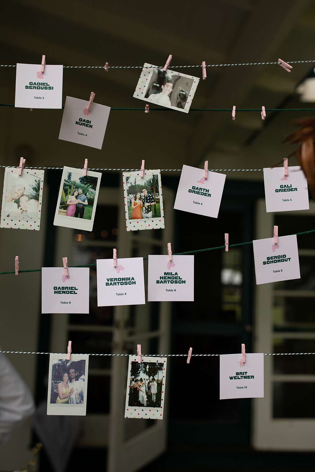 Many! We had the lei chuppah, made with some of the leis and notes that the guests strung. We had babka flown in from NYC because it’s something we ate and baked a lot together in New York. We had custom scalloped napkins embroidered with one of my doodles of us that the guests got to keep. We had secret missions that were funny things the guests had to do throughout the weekend without being called out (i.e. get someone to compliment you on your eyebrows, do find out someone's Dad’s middle name). We had our custom song! My friend Kelsey made some pottery for the table since she couldn’t be there. For the seating chart cards, each of them had one of the doodled icons to represent their table. We hung the name cards on mini clothespins that later served to hang polaroids from. I found some glow-in-the-dark clothespins online that made that whole display light up once it got dark.