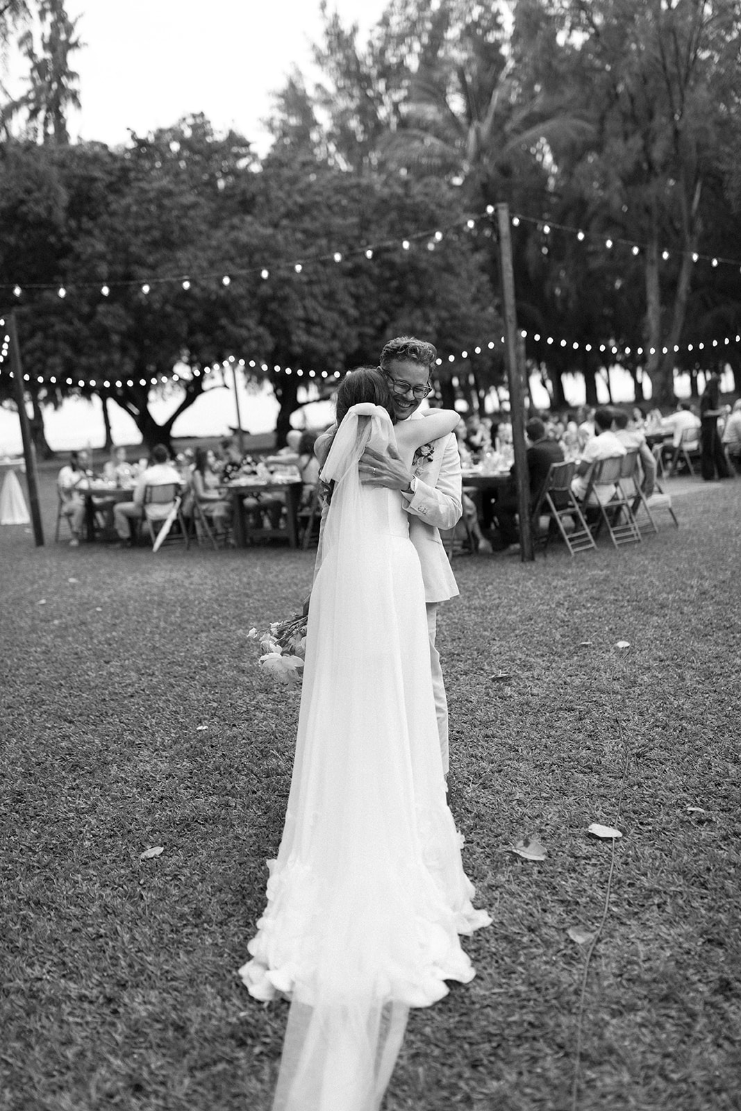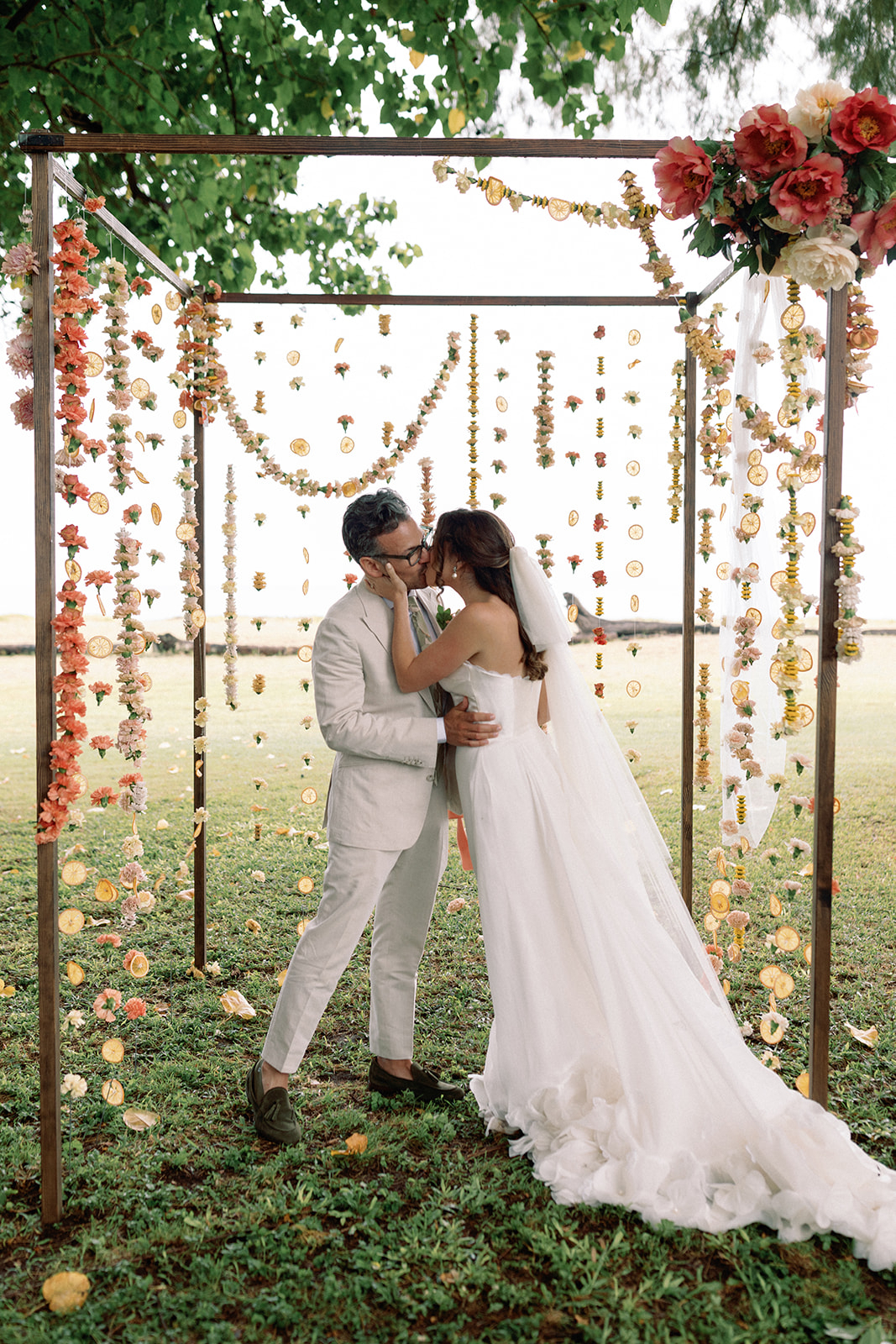 Throughout the planning process, we had wonderful vendors who supported us in bringing our vision to life. Krisy Zietz, our on-island planner, was patient with our unconventional ideas. House of Deane created my dream dresses. Sunrise Blooms helped bring our lei chuppah concept to life and decorated the tables beautifully.