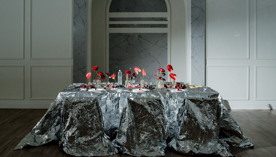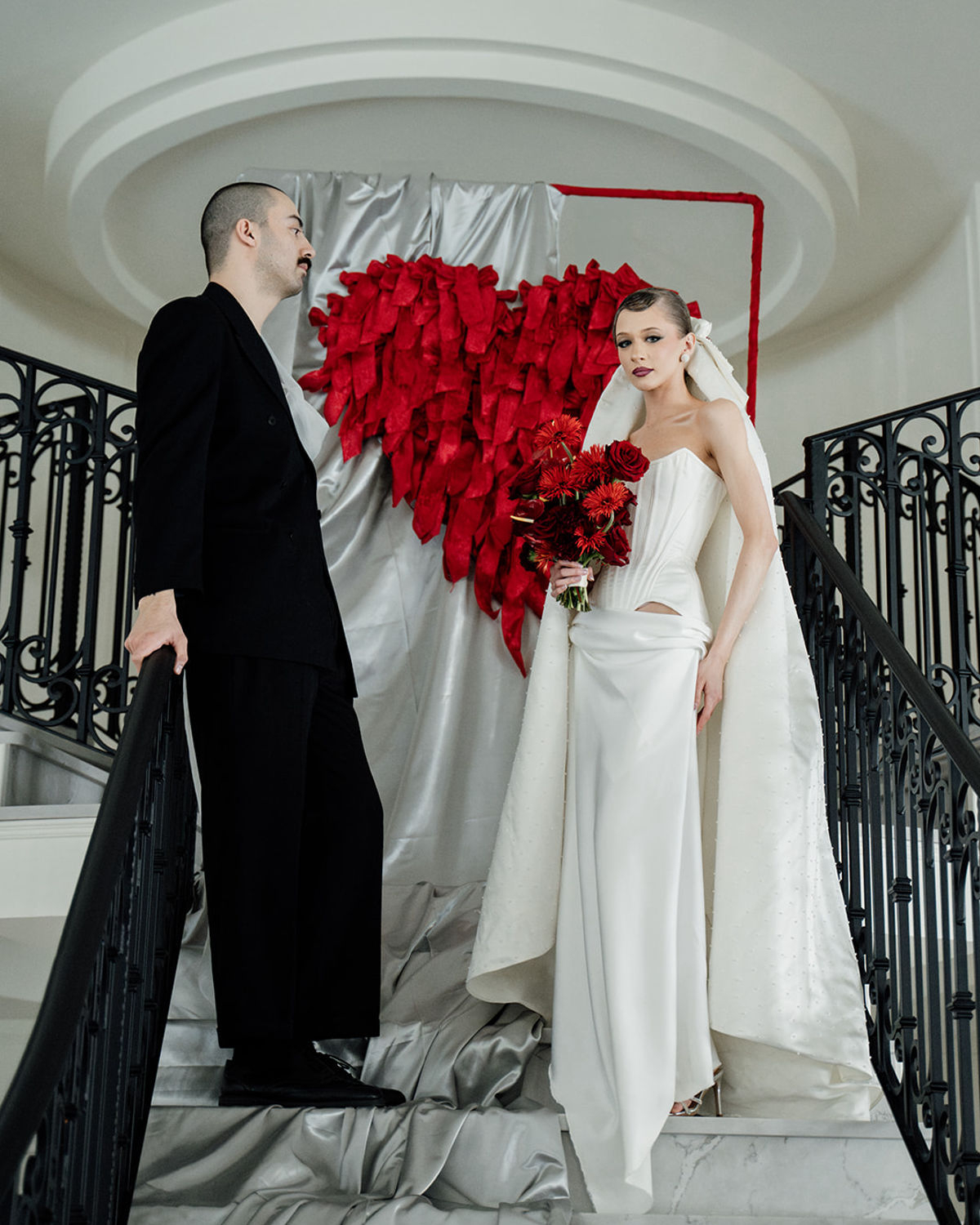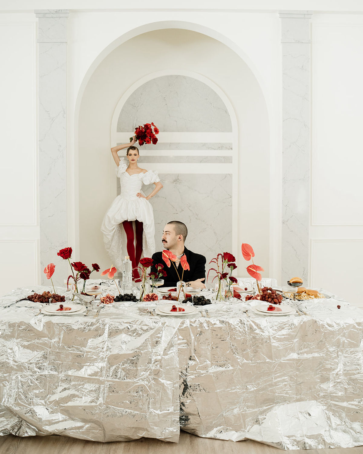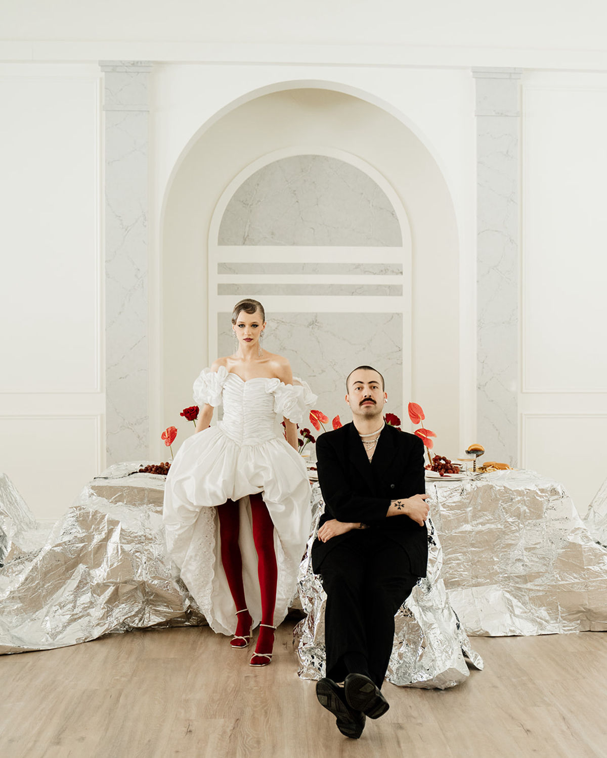 Bold, unconventional, and daring, this editorial, captured through the lens of OM Wedding Storytelling, pushes the boundaries of wedding aesthetics as we know them. Classic whites, set against a clean backdrop, clash with fierce red accents and reflective foil metallics, creating a striking contrast between timeless elegance and avant-garde edge. Sculptural silhouettes, bold textures, and unexpected details weave together a narrative of rebellion meets romance—where tradition is honored but never confined. An unapologetic expression of style, it’s an ode to fearless love and the simple joys of life, infused with a rebellious twist. Edgy, sophisticated, yet undeniably chic.