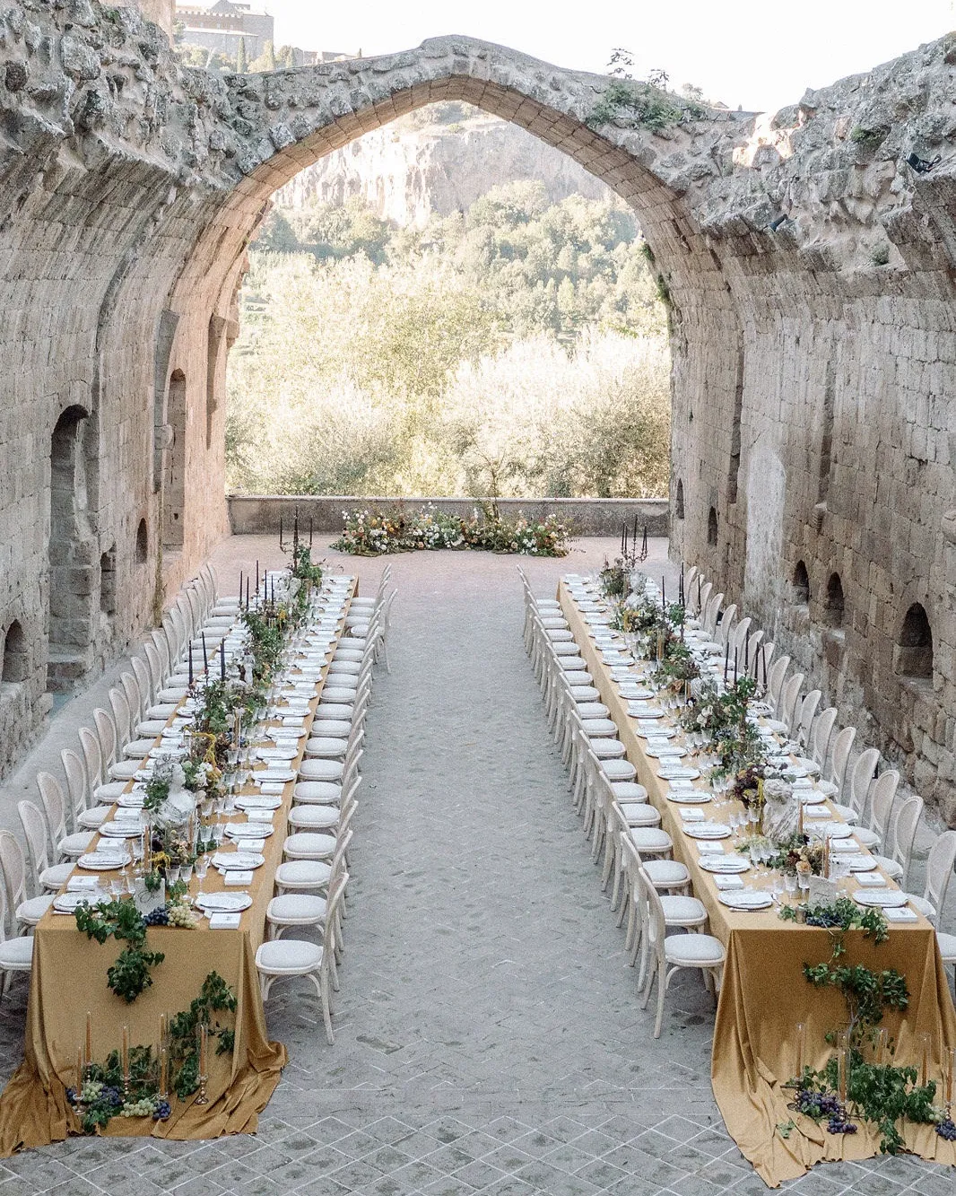 In the intimate ceremony, Ioanna & Nikolas exchanged their vows amidst the imposing courtyard walls of La Badia, surrounded by a small amphitheater of chairs. And when the sun set, the abbey's ruins provided a dramatic, open-aired reception space for a sumptuous dinner under the stars.