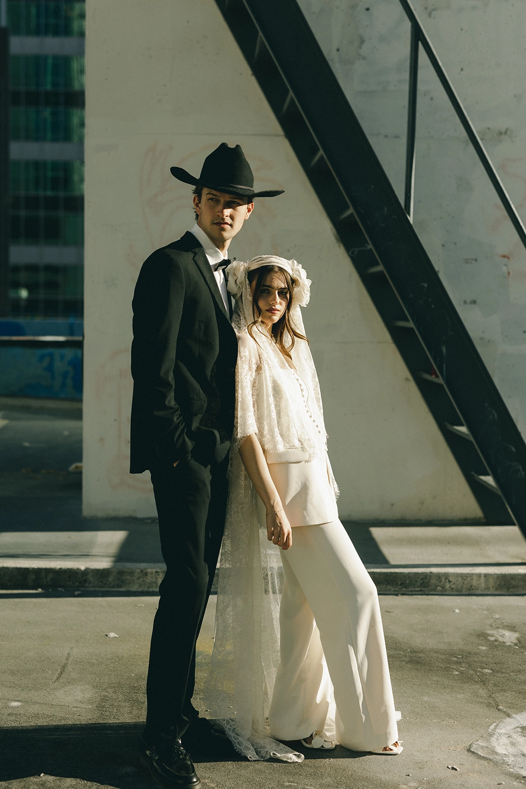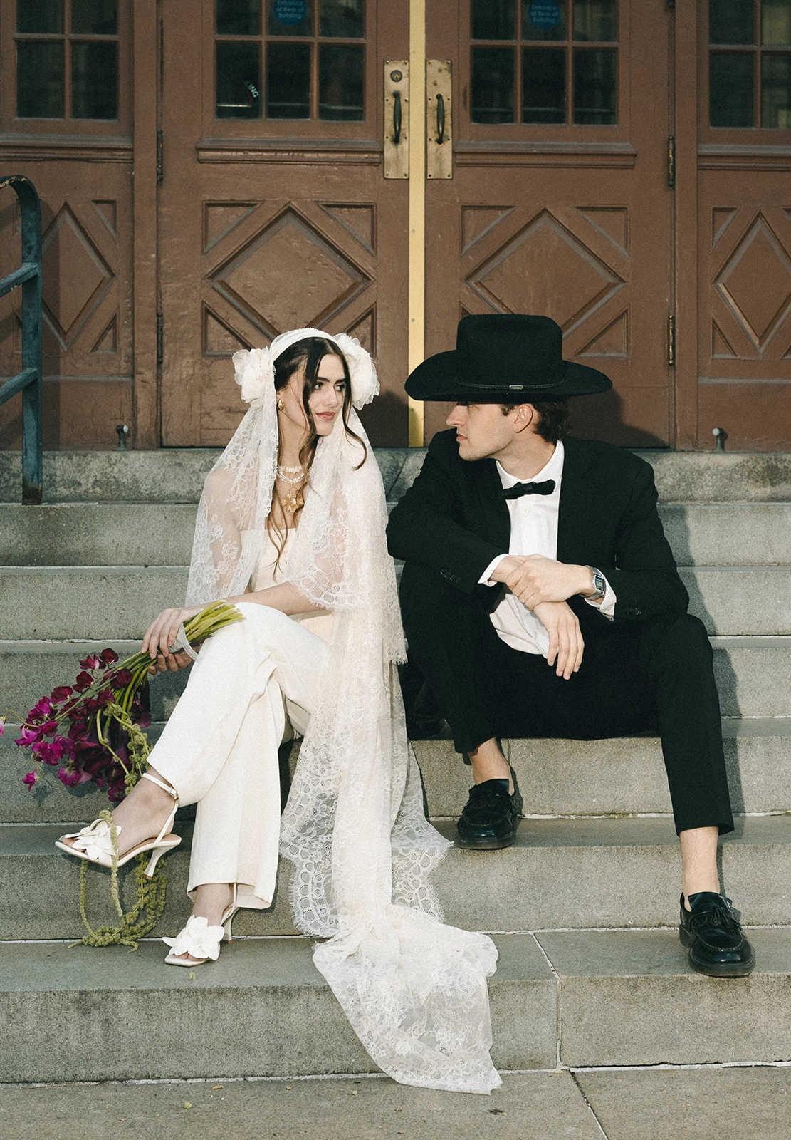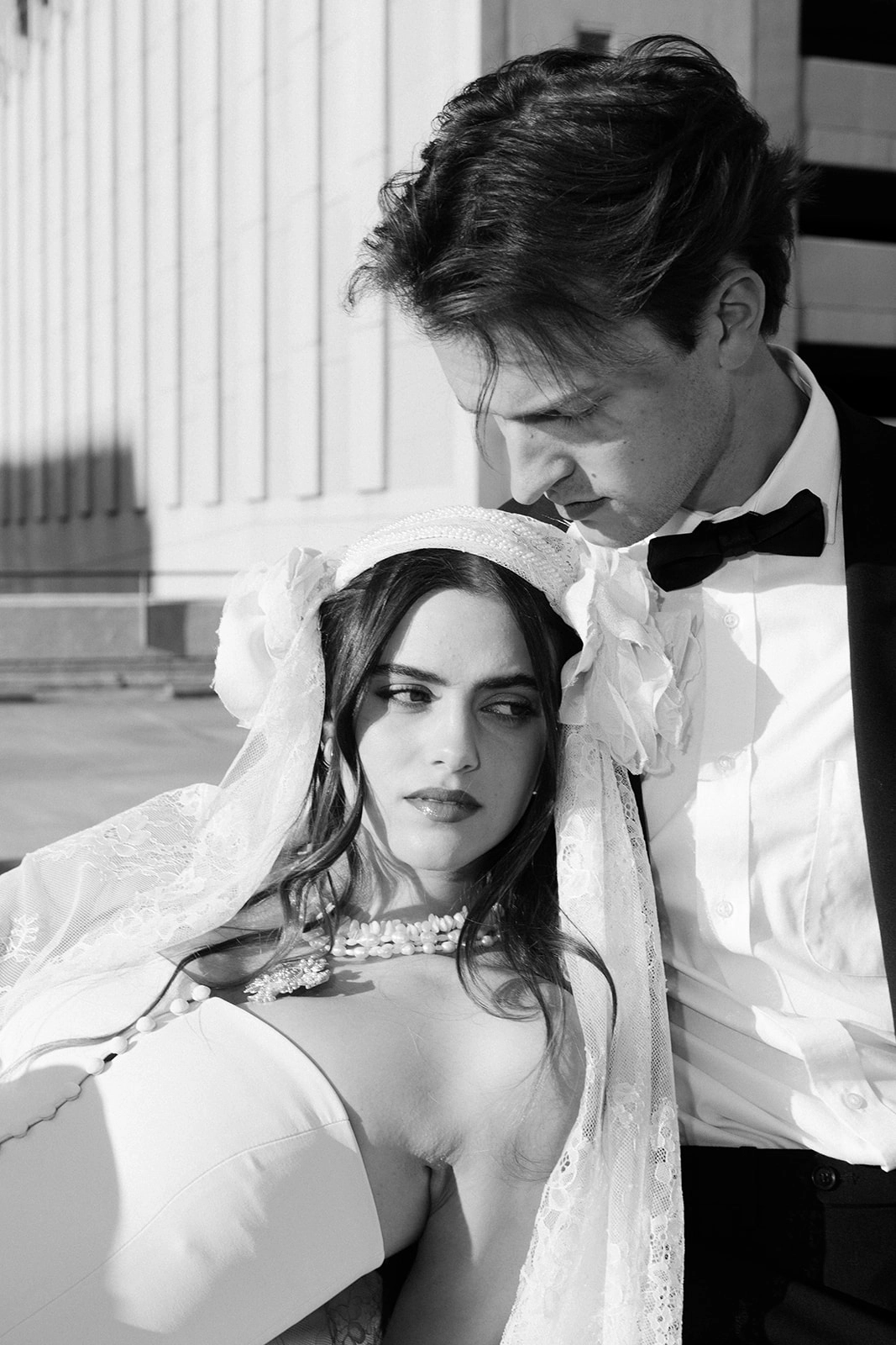 Abby Hart, the talented photographer behind this wonderful shoot, was inspired by Jean Paul Gaultier's veil from his Spring 2008 ready-to-wear collection. Charmed by its out-of-the-box design and intricate vintage lace, Abby meticulously hand-stitched a similar headpiece, which became the highlight of the model bride's wedding ensemble.