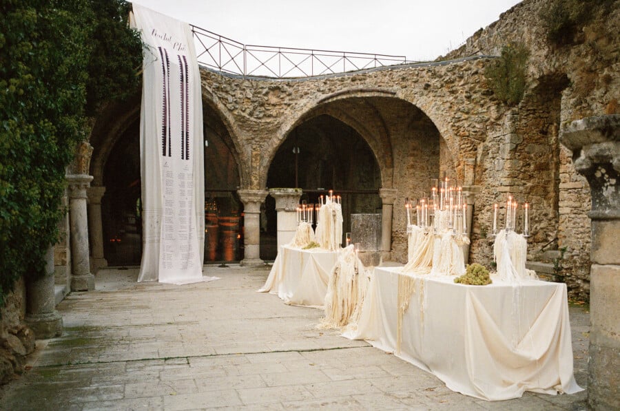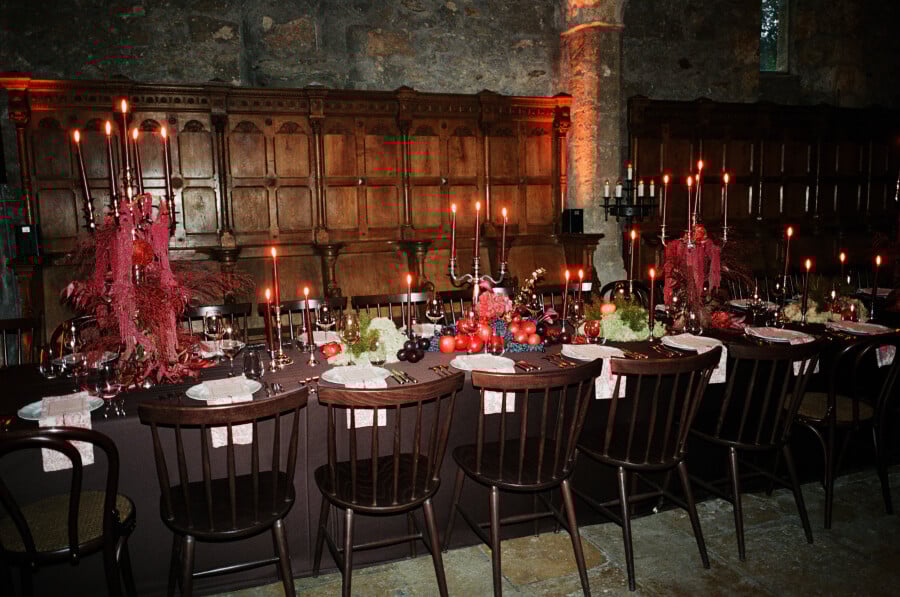 Just outside Paris, where forest meets stone and centuries of history linger in the walls, Rachel and Phil gathered their closest people for a wedding that felt less like a single evening and more like stepping into a world of their own making. Styled by our members from Bow Creative, the celebration moved effortlessly through spaces filled with candlelight, textures, and thoughtful designs. Ceremony design remained intentionally restrained within the abbey’s dramatic ruins, where organic florals and wooden benches quietly echoed the site’s history. As the evening progressed, deep red florals, moss, fruit, and abundant candlelight transformed the refectory into something lush and atmospheric, while a roaming saxophonist and late-night tattoos kept the energy alive long after dinner. Beautifully documented by our member wedding photographer Weddings By Nato, the celebration felt intimate, expressive, and unmistakably personal.