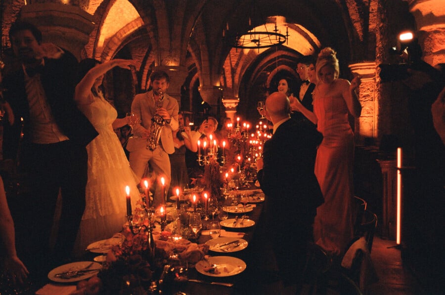 We broke the reception into two parts: dinner and then Chez DewClaw. Guests were guided from the cocktail hour to dinner along a path of overflowing candlelight, the glow pulling them forward into the Abbaye’s historic refectory, already alive with music. Outside, as Phil and I practiced our first dance in the fading light, we could hear it all beginning—Paris Society’s Zoran dropping incredible beats, and Thoj, the saxophonist, moving effortlessly through the room, at times standing atop the tables, his music weaving between guests and stone. For the design, we intentionally shifted the floral palette from the green-and-white tones of the ceremony into rich, deep reds—colors evocative of old tapestries, ripened fruit, and the forest at dusk. The transition mirrored the movement from day into night and called back to the Abbaye’s history as a hunting lodge. Moss, fruit, and abundant candlelight layered the space, creating a sense of warmth, texture, and immersion, as though the room itself had come alive.