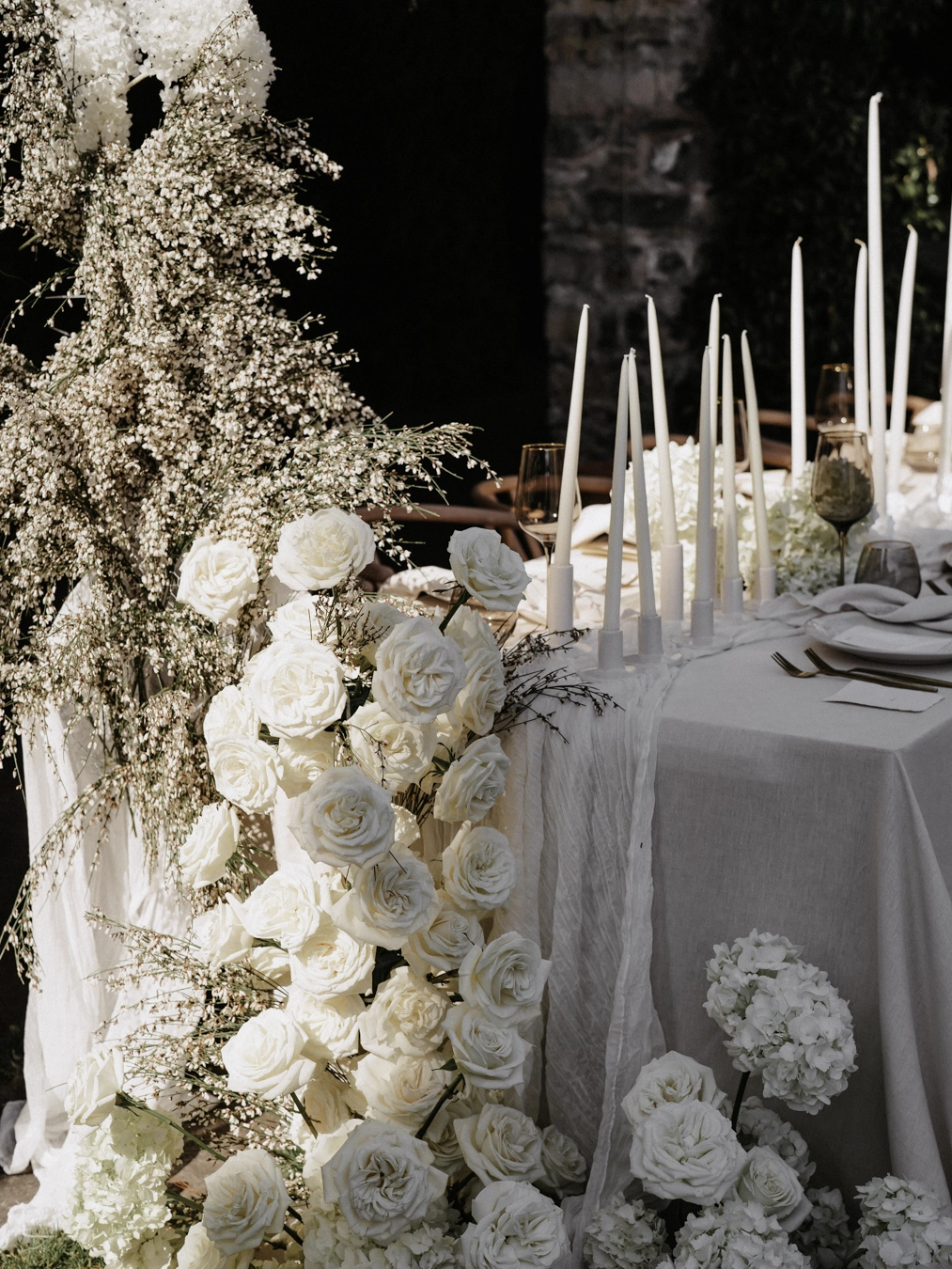 A remarkable element of this photoshoot is also the extraordinarily all-white table setting. The crisp and clean palette serves as a canvas for pure elegance and sophistication against the dark blue backdrop of Lake Como. This refined and modern setting evokes a sense of magical editorial romance that is both visually striking and emotionally evocative.