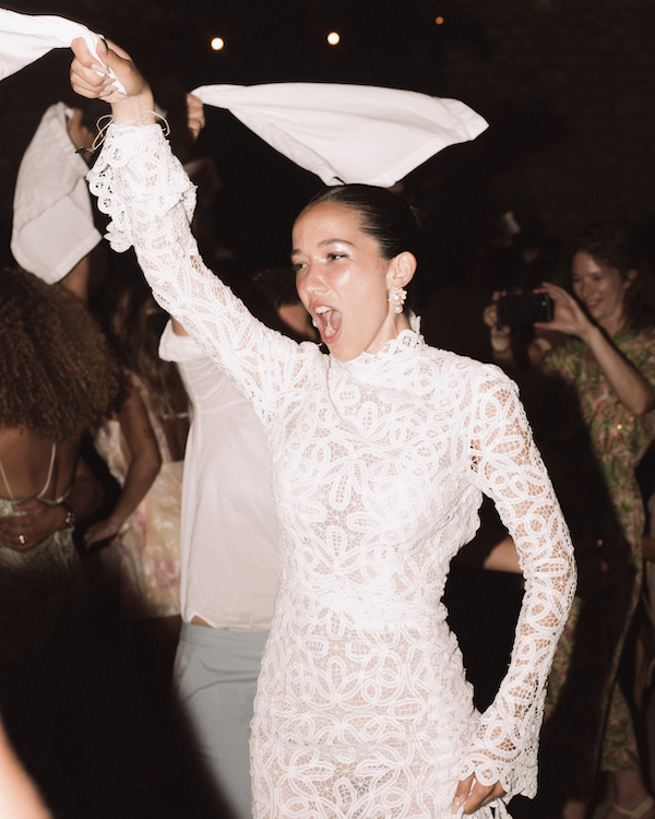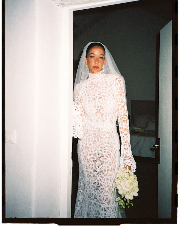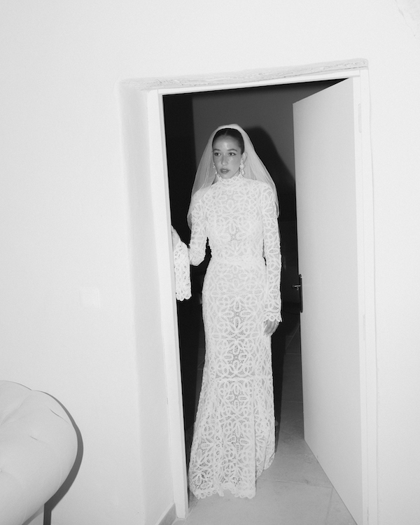 For both weddings (the one in Paris and the one in the South), my main dresses were from Inbal Dror. If I focus on the wedding in the South, it was an absolutely stunning lace gown—very sheer, yet just modest enough to remain elegant. My initial vision was inspired by the Dolce & Gabbana style: the Italian woman, the Madonna. Almost tragic, yet wildly sensual, accentuating my curves. I also wore a veil for my entrance and carried a very simple bouquet. My shoes were hidden, so I opted for nude-colored sandals with delicate straps. My evening gown was a pearl-colored dress from House of CB, which I accessorized with a pearl necklace, a short veil, and Gucci shoes. For the brunch, I wore a very flowy dress from Datt.