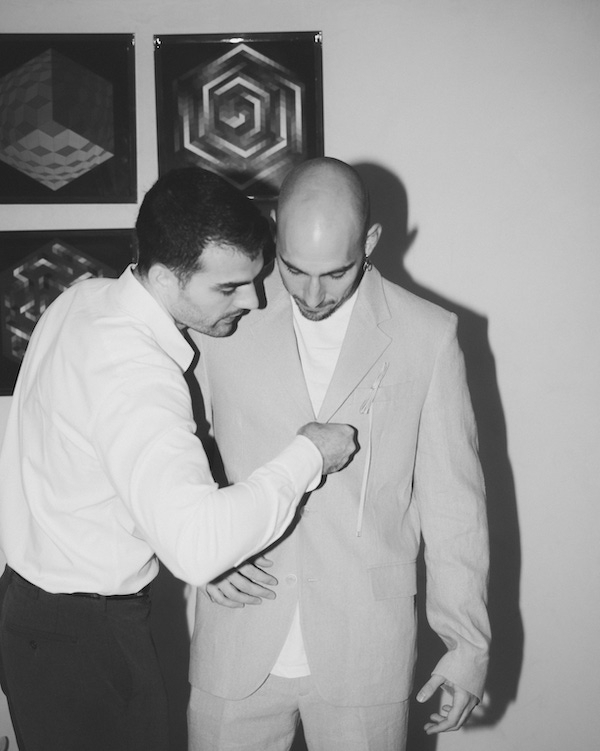 My husband wore an oversized suit by Jacquemus, and to break away from a too conventional look, he paired it with a white t-shirt and Air Force 1s. To accessorize, he added an earring from a Parisian brand we love, Anne-Lise Michelson.