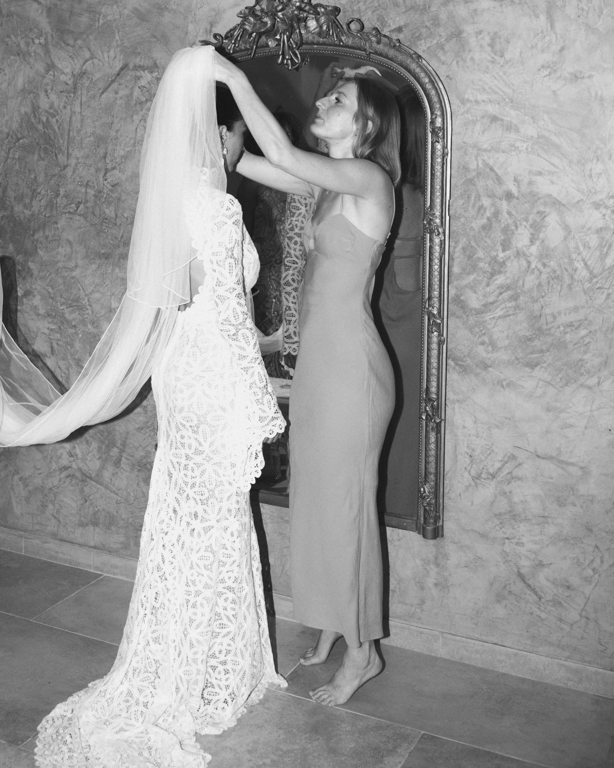 In keeping with our desire to be surrounded by loved ones and to create something that reflected us, most of the vendors were friends or people I had previously worked with and felt a certain connection to. Jacquie Club (Victoria), the caterer, was a young entrepreneur I had met at the very start of her journey nearly two years ago, and I wanted to place my trust in her for this important occasion. It wasn’t the easiest choice, as we had to bring her down from Paris to the South, but her work was simply fabulous. For my hair and makeup, I chose a very good friend with whom I regularly work on shoots, Helena Henrion. For the photography, I didn’t want a typical wedding photographer, as I often find that style a bit outdated. Instead, I fell in love with Ramone’s eye. He’s incredibly talented and quickly understood my vision, following the direction I had given him perfectly.