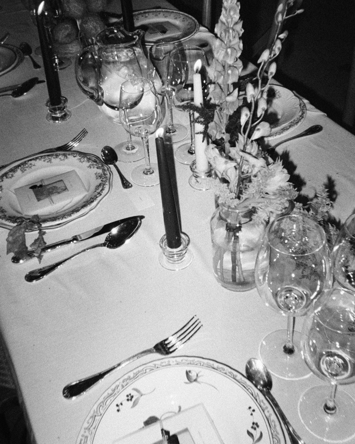 For the music, we had the pleasure to have DJ Coco who’s a friend and also a young talent with a promising future (Dapper). I also had two other DJ friends who made fantastic appearances throughout the event. For the flowers, we worked with a floral artist I admire from Marseille, Acampa (Augustine Tisserand). She followed my rather complex request to the letter. It’s quite a challenge to have dark and neutral-toned flowers in the summer, but she pulled it off. As for the table decor, I spent a year treasure hunting at flea markets and second-hand sales. Each piece, every plate, was carefully chosen by me, and I absolutely loved the process.
