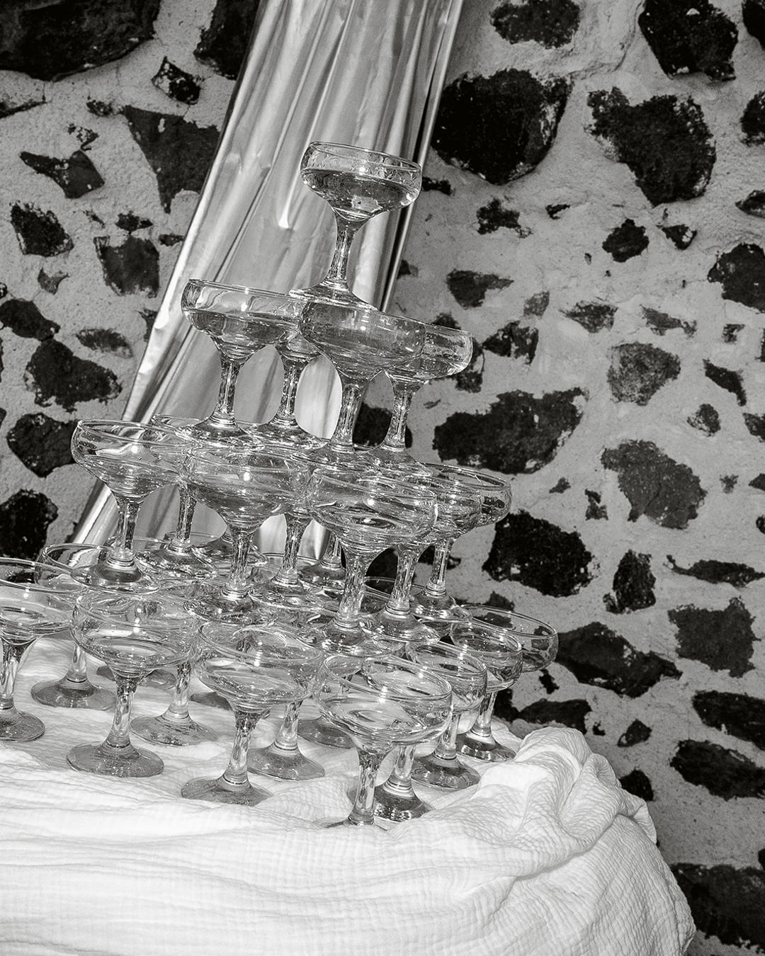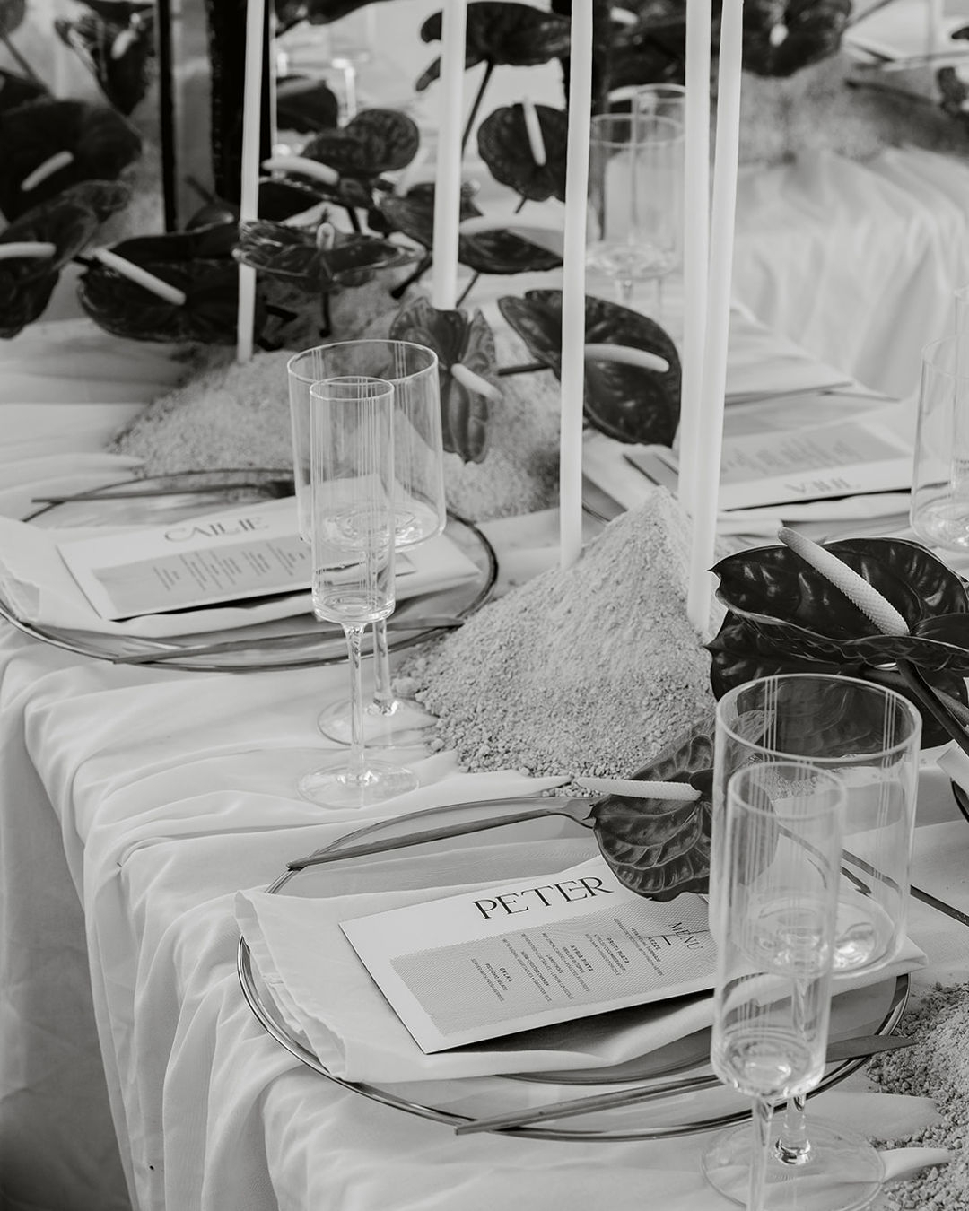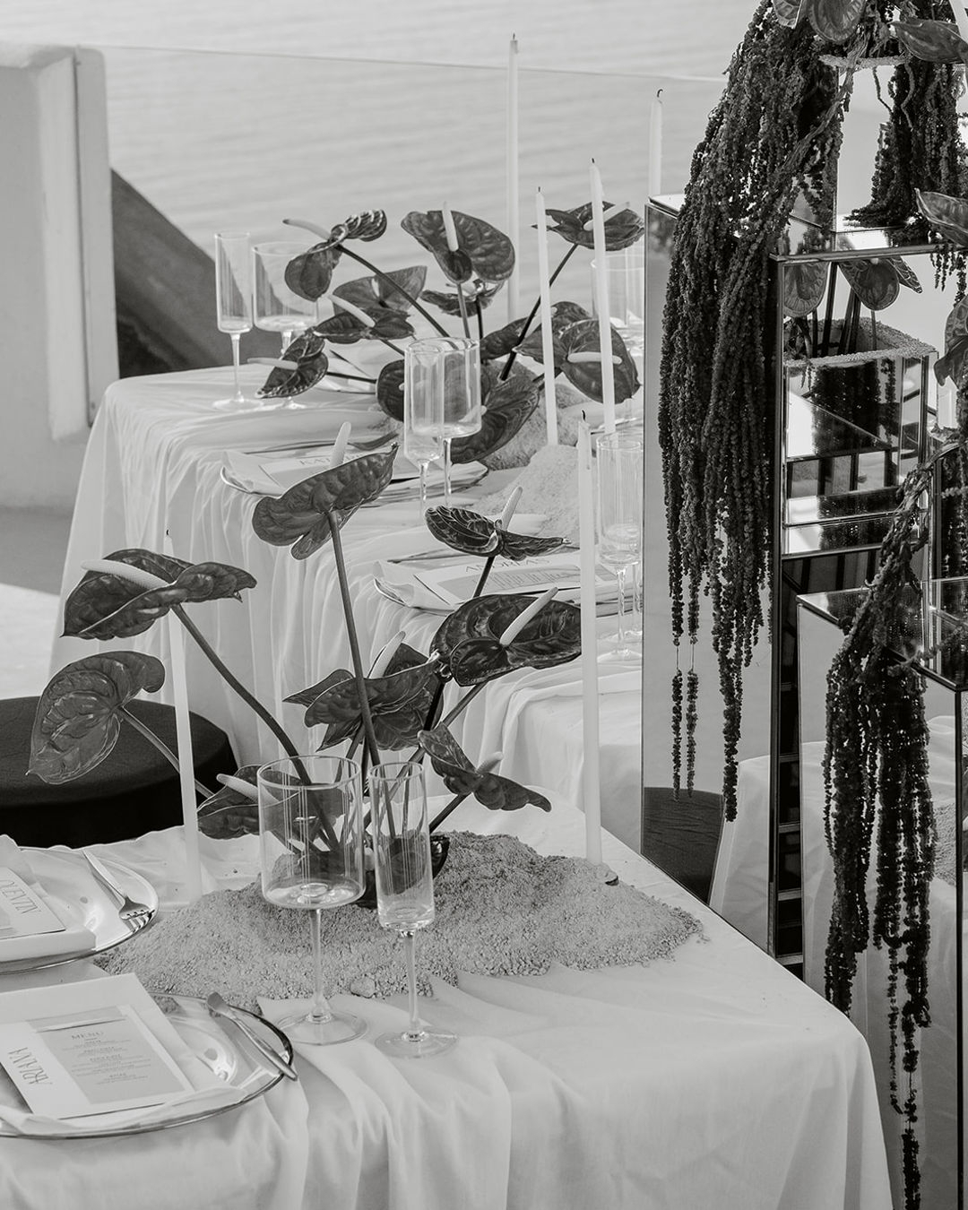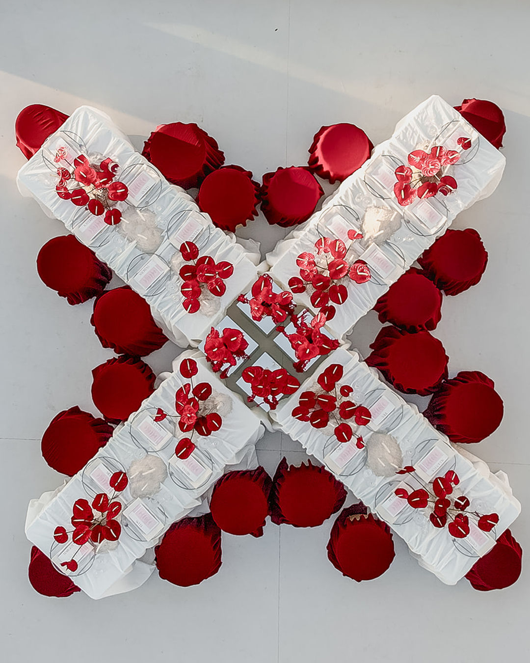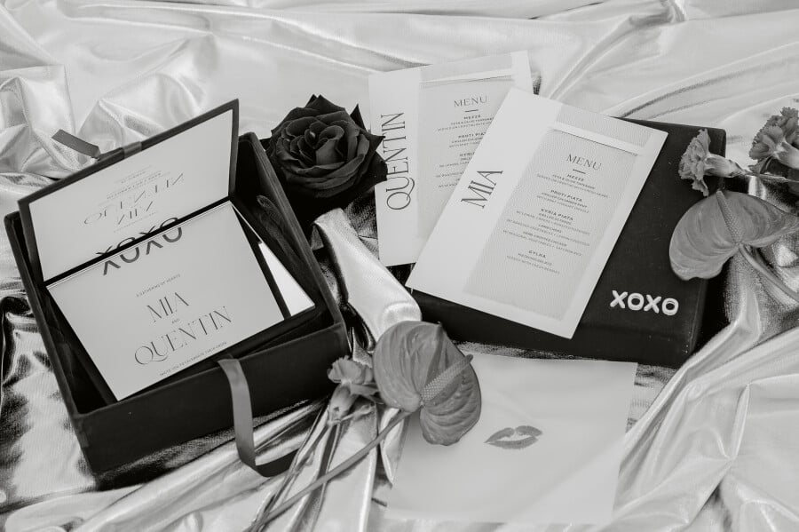 Reflective metallics intertwine with crisp white and cherry-red accents, striking a balance between dramatic expression and refinement. Every aspect of the shoot was styled with a deliberate focus on both contrast and cohesion, from the vivid anthuriums and flowing fabrics to the playful yet minimalist stationery and intricately detailed bridal elements. Each component works alongside the others in harmony, complementing the serene blue and aqua tones of Santorini’s iconic skyline.