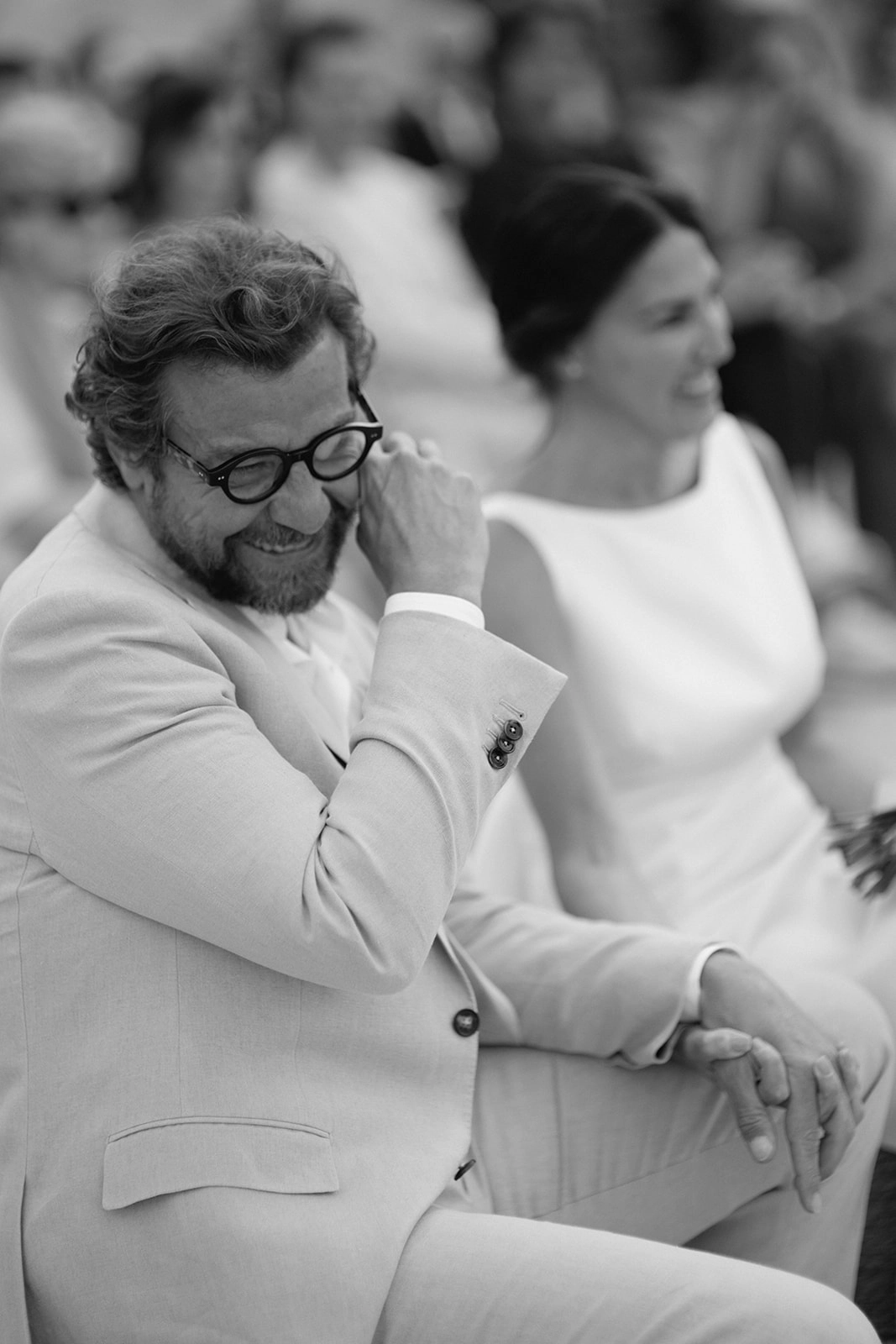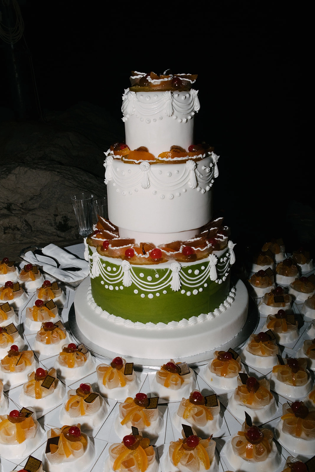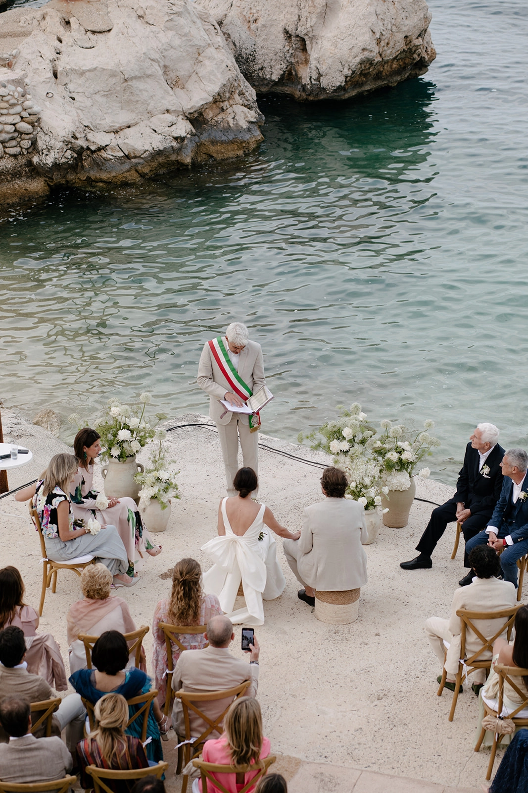 For the ceremony, Giuseppina stunned in a minimalist Le Spose di Gio dress with a large bow on the back, later changing into an Alberta Ferretti tulle dress for the party. She paired both gowns with Jimmy Choo sandals. Claudio chose an elegant Zegna suit in light colors, perfectly complementing Giuseppina's attire.