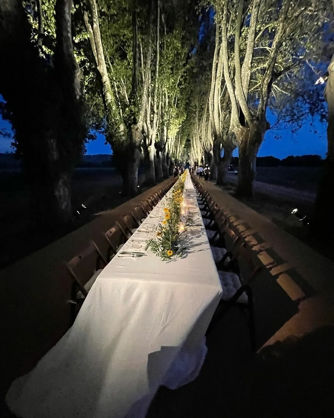 Once the official part of the wedding was over, the newlyweds continued the celebration at Château de Bonneval. During the cocktail party, the designer’s father and brother played a few songs live with the band as a gift for both Simon and Marco. All the guests couldn’t help but dance! Then everybody joined the big dinner. The festive table was set outside and spread along the road that led right to Simon's mother's home. Judging by the photos from the event, the views and setting were mesmerizing!