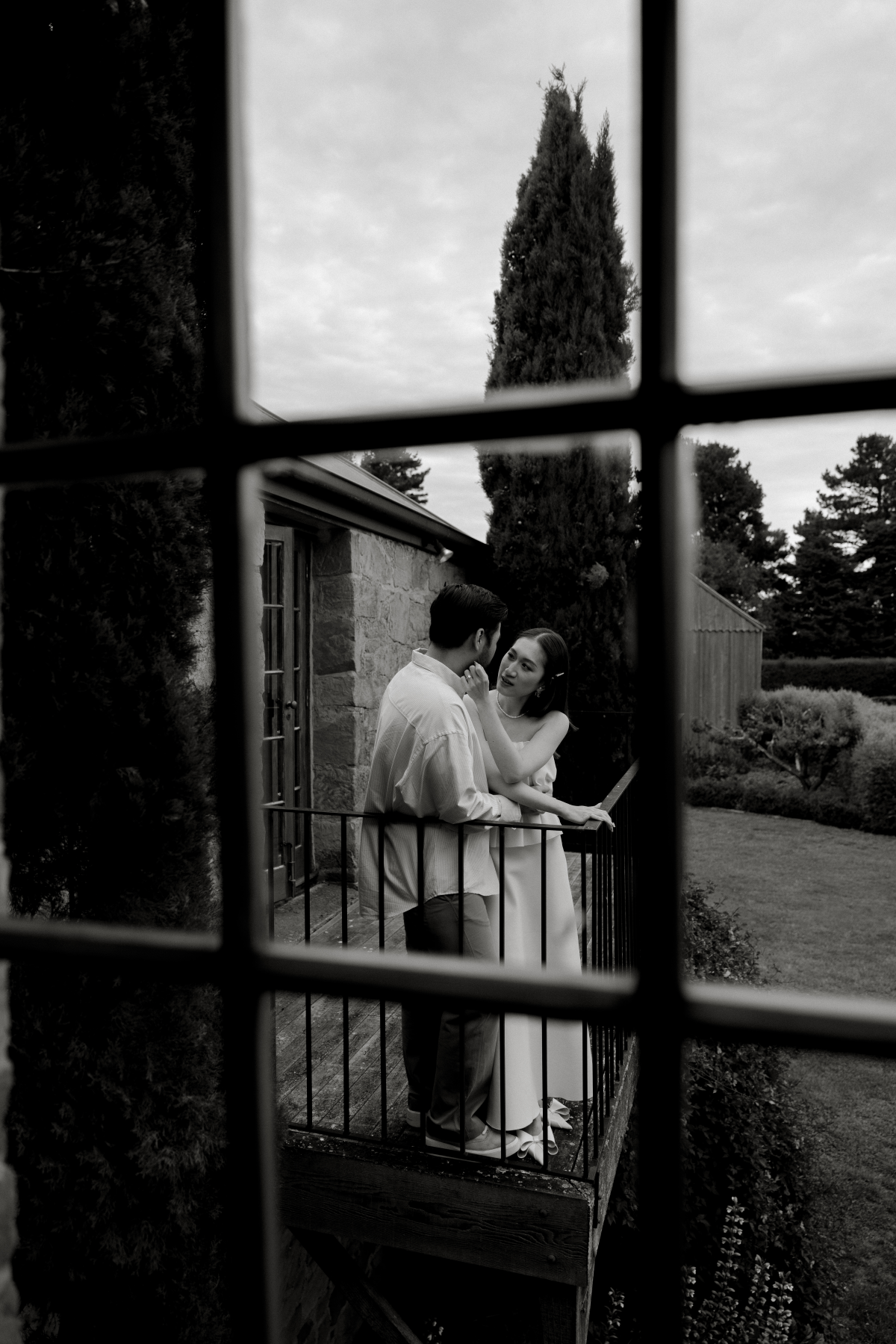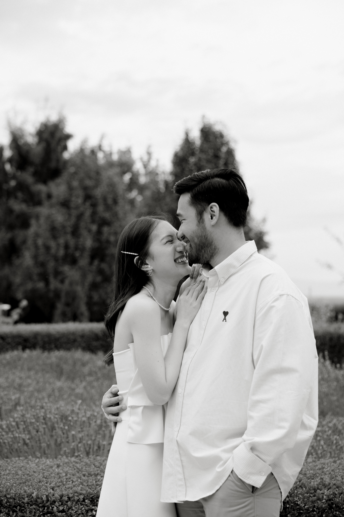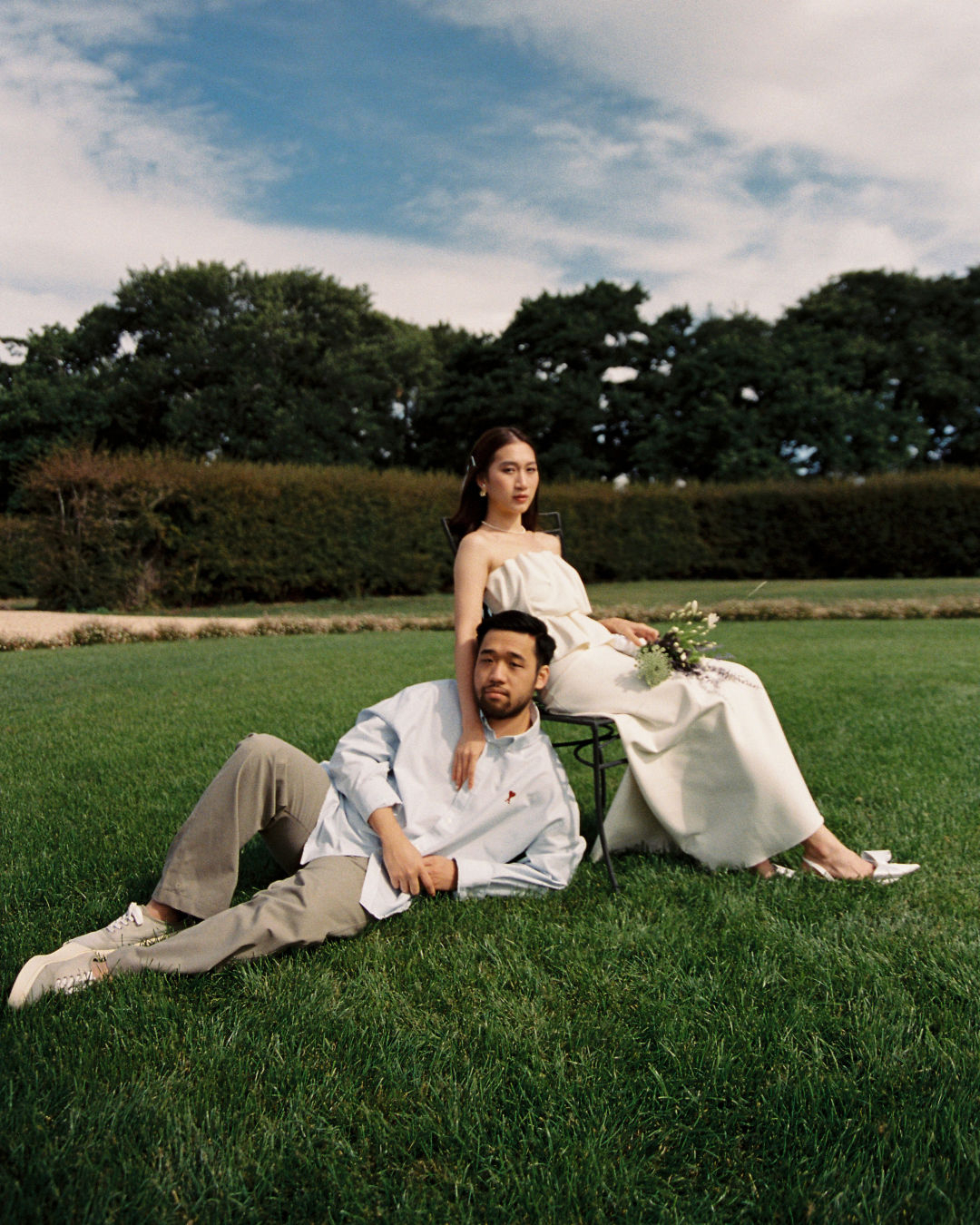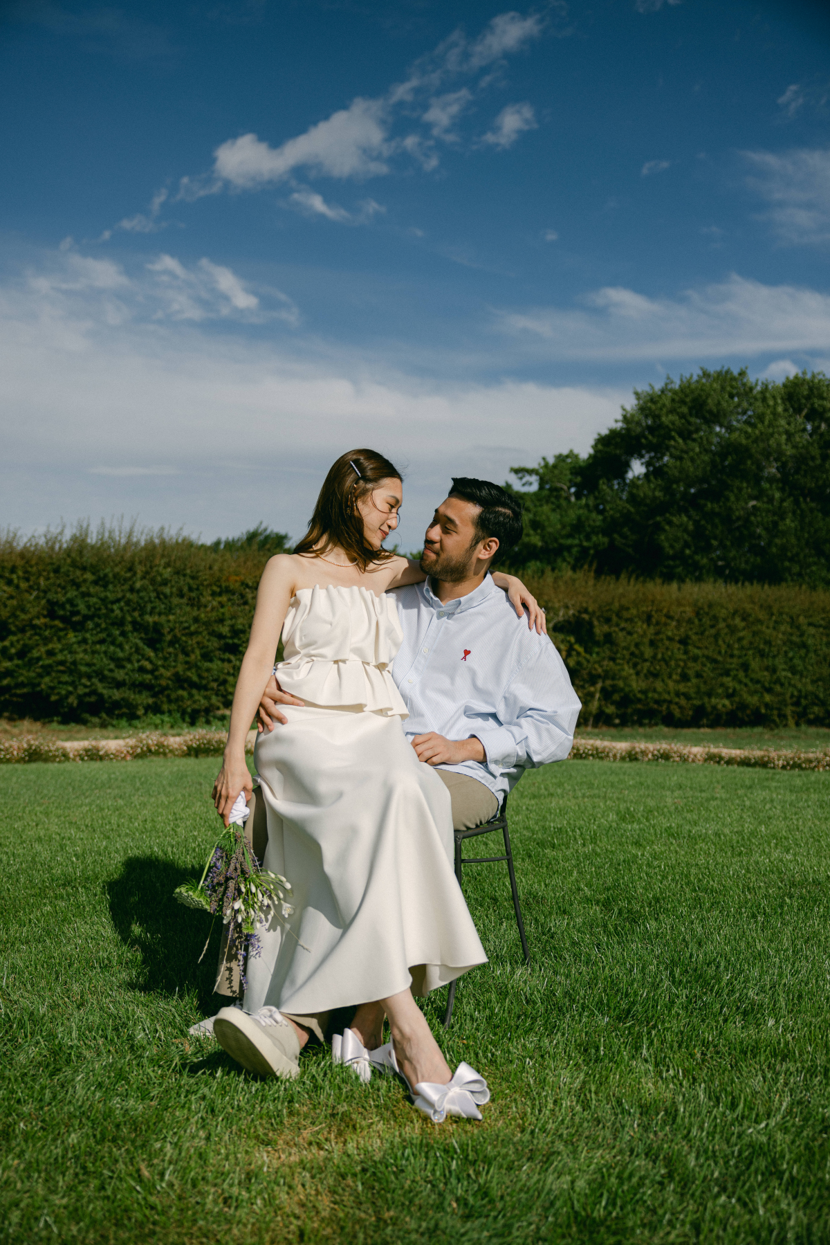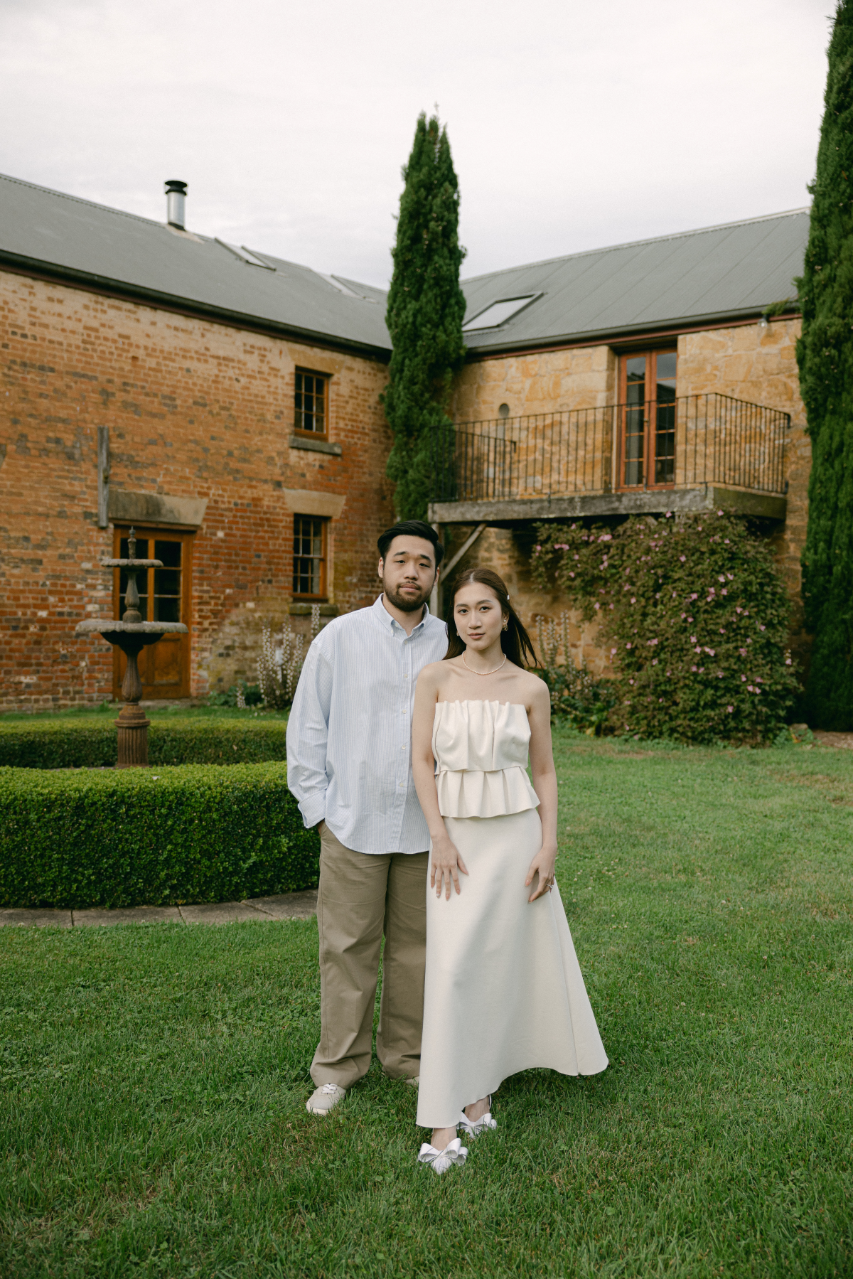 Timeless sandstone houses, fields of fragrant lavender, boundless meadows, and charming ambiance – the setting for Uyen & Phi's magical engagement shoot captured by THE WED member Renee Green. Set on a sprawling Tasmanian estate, The Granary evokes all the poetic charm of the South of France — a place dear to the bride's heart. Intimate and deeply personal, the shoot embraced the tender moments shared by two souls madly in love. The couple chose simple yet elegant attire, reflecting their personal styles. Phi's ensemble, an elevated interpretation of his beloved relaxed t-shirt and sneakers look, exuded effortless sophistication, while Uyen's two dresses, each emphasizing texture, silhouette, and form, embodied the essence of a modern, fashion-forward bride.