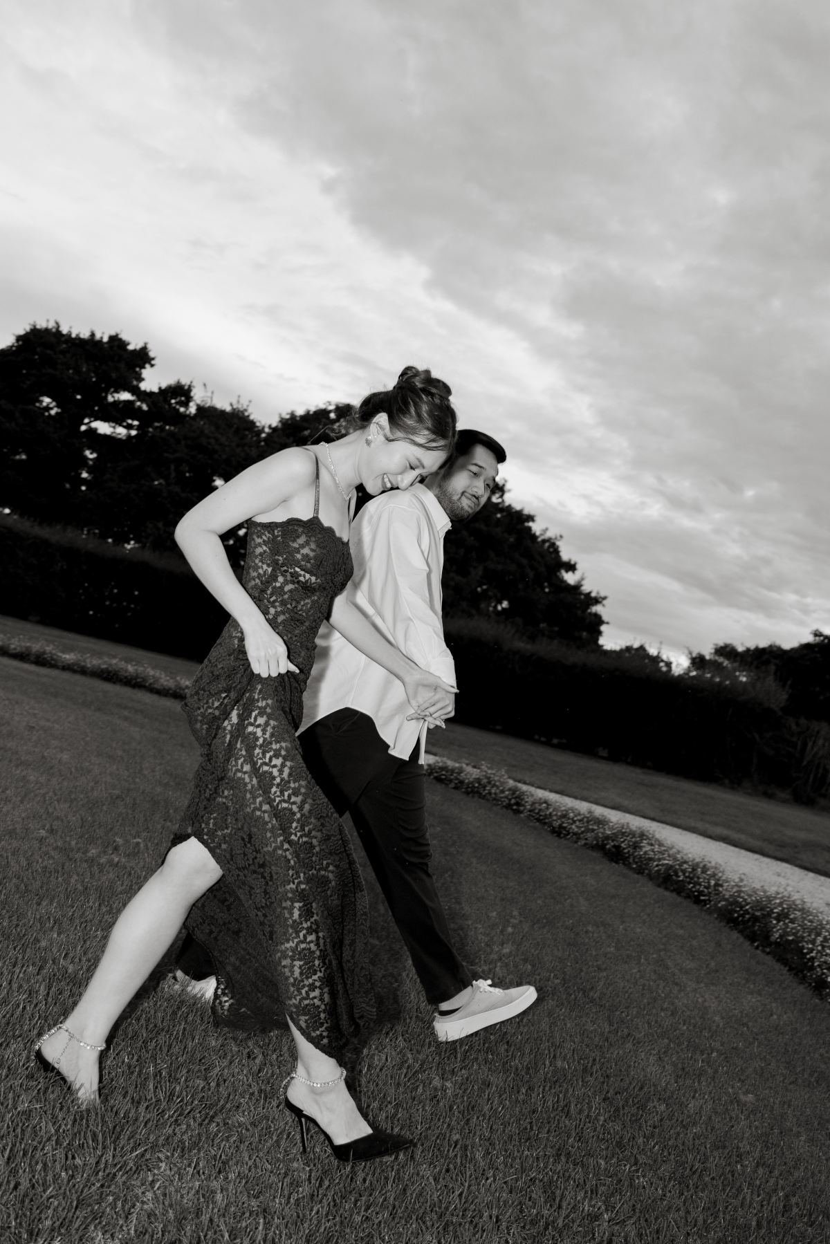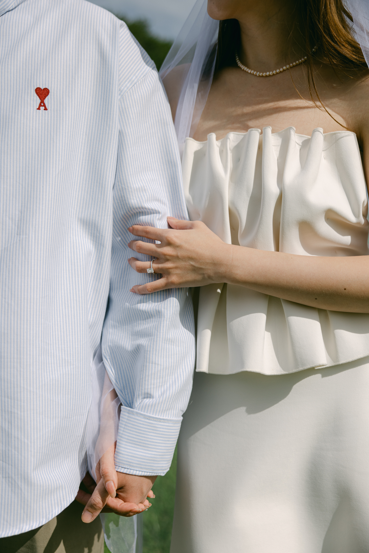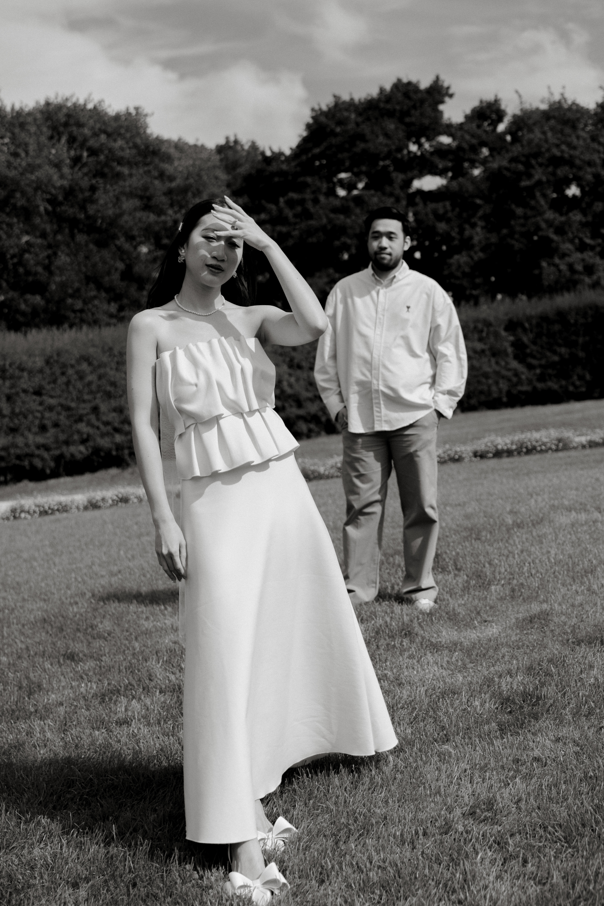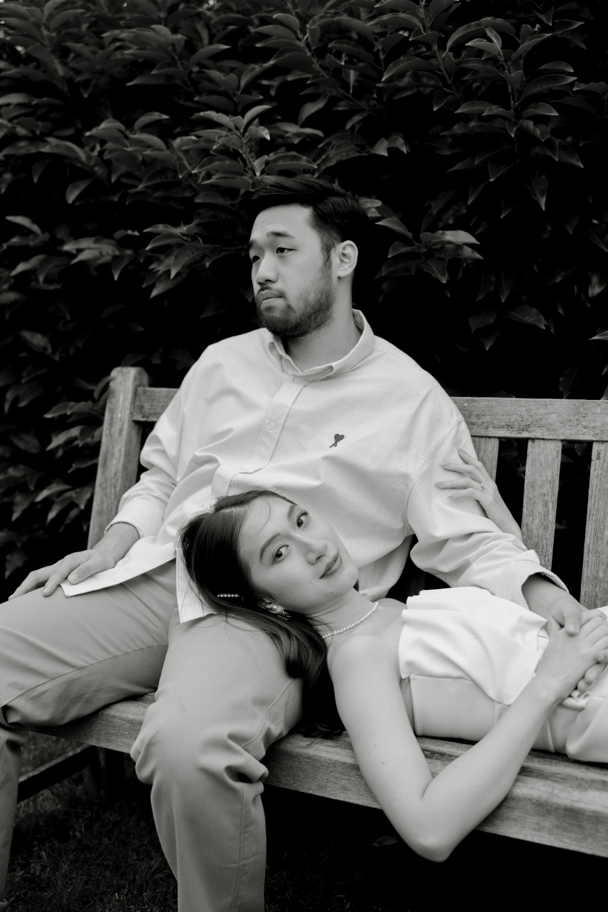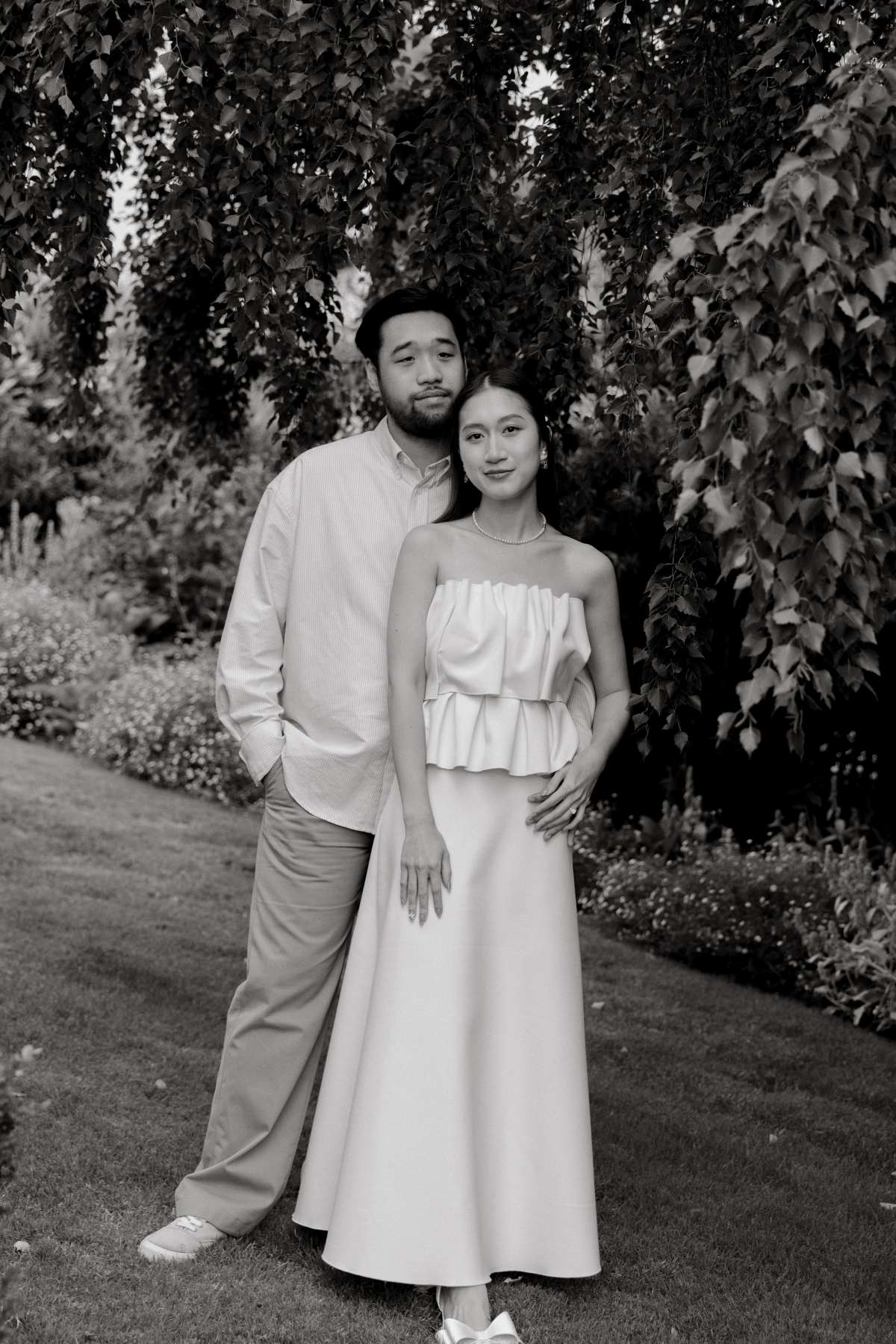 Timeless sandstone houses, fields of fragrant lavender, boundless meadows, and charming ambiance – the setting for Uyen & Phi's magical engagement shoot captured by THE WED member Renee Green. Set on a sprawling Tasmanian estate, The Granary evokes all the poetic charm of the South of France — a place dear to the bride's heart. Intimate and deeply personal, the shoot embraced the tender moments shared by two souls madly in love. The couple chose simple yet elegant attire, reflecting their personal styles. Phi's ensemble, an elevated interpretation of his beloved relaxed t-shirt and sneakers look, exuded effortless sophistication, while Uyen's two dresses, each emphasizing texture, silhouette, and form, embodied the essence of a modern, fashion-forward bride.