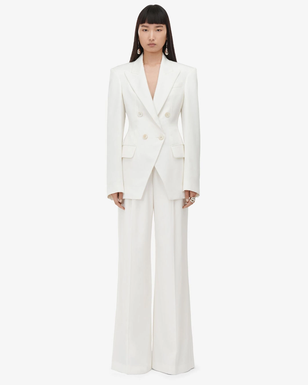 Alexander McQueen Double-Breasted Cut Away Jacket, $3,400, and Double Pleat Wide Leg Pants, $1,350