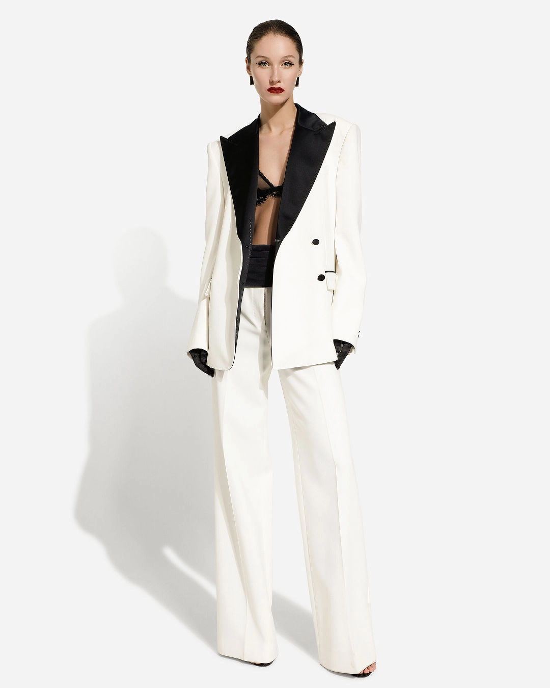 Dolce & Gabbana Double-Breasted Wool Crepe Jacket, $4,595, and Flared Pants, $1,275