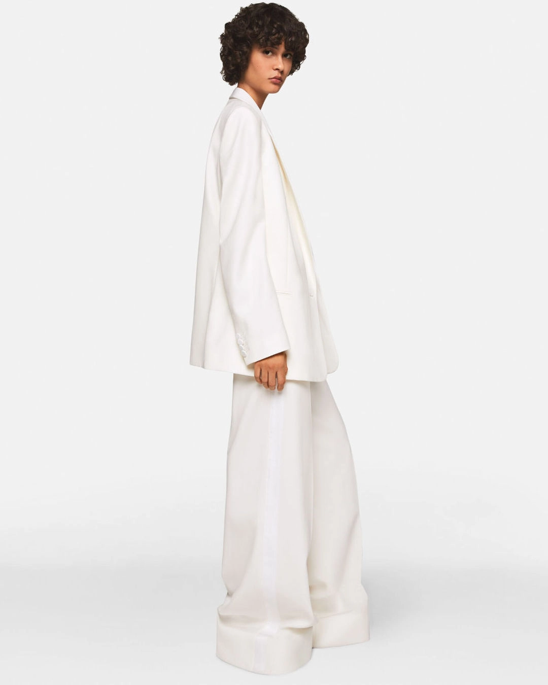 Stella McCartney Wool Blazer with Shawl Lapels, $1,990, and Pleated High-Rise Wide-Leg Pants, $1,090