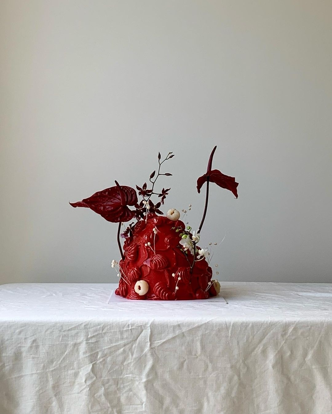 It's no denying red is having a moment this season, and cakes are no exception. Painted in rich lipstick, fire engine and burgundy reds from top to toe, these cakes are strikingly hard to miss. To ignite the palette, pair with a flavor profile of strawberry, watermelon, or rosewater, or a classic red velvet cake.