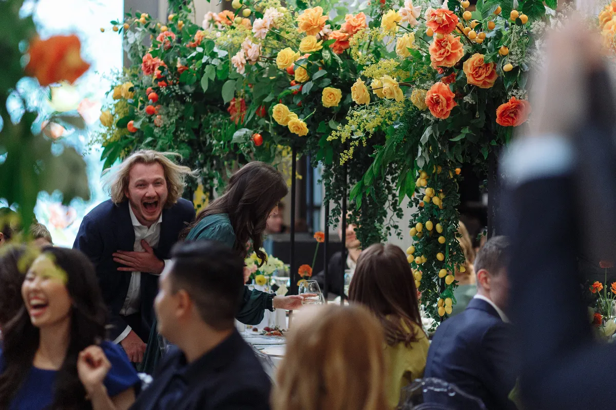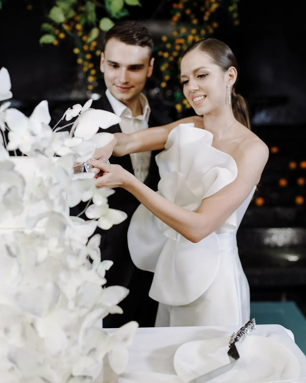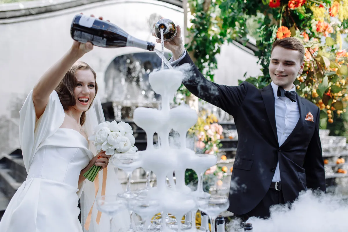 The entertainment included stilt-walkers, Italian songs from the guitarist and vocalist duo, a band, and bartender's theatrical cocktail-making. The newlyweds created the special gift for their parents - a touching video tribute, which they recorded in advance. After the ceremony, the couple filled the champagne pyramid and cut the cake. They also prepared a book for guests to write their best wishes next to photos taken together.