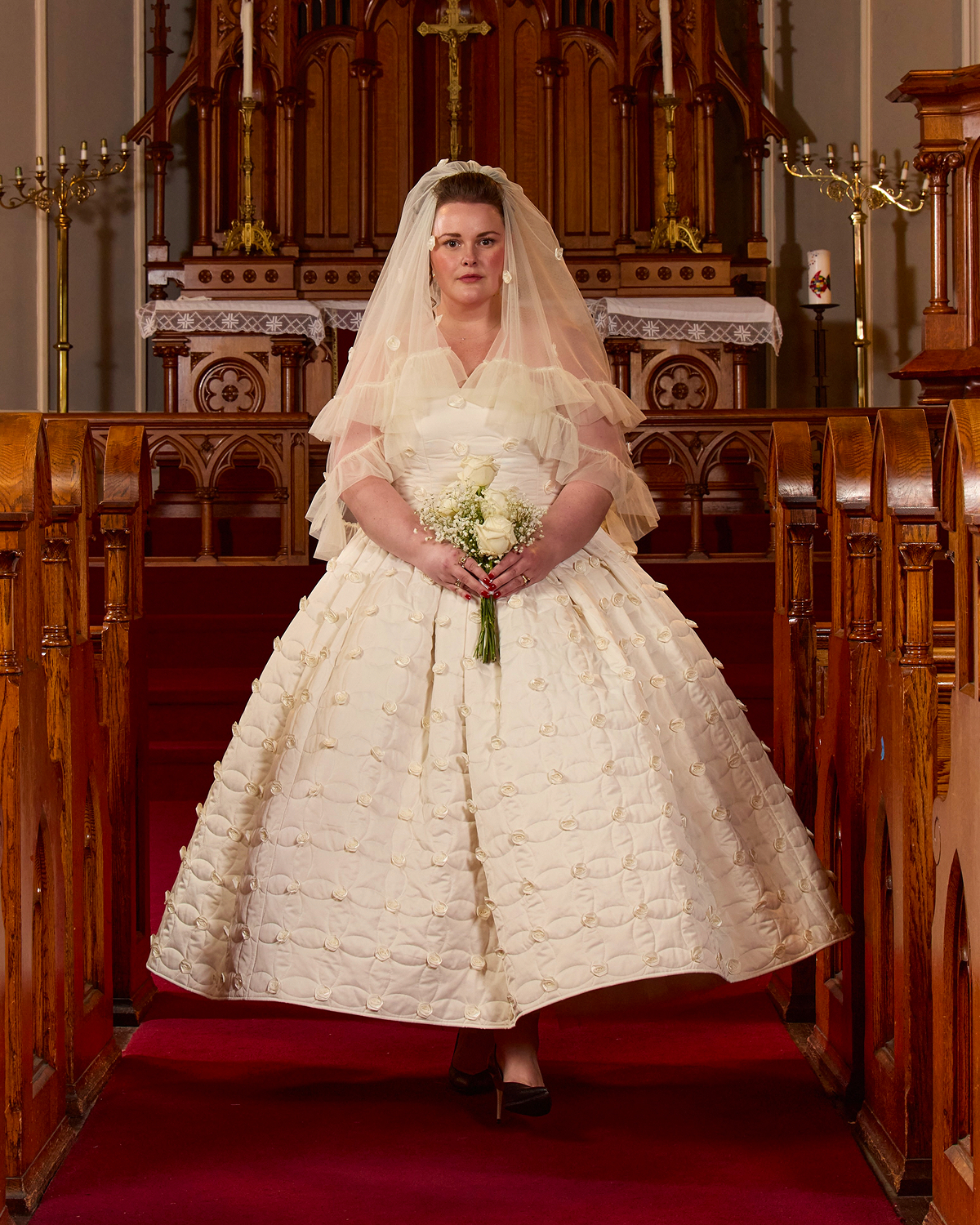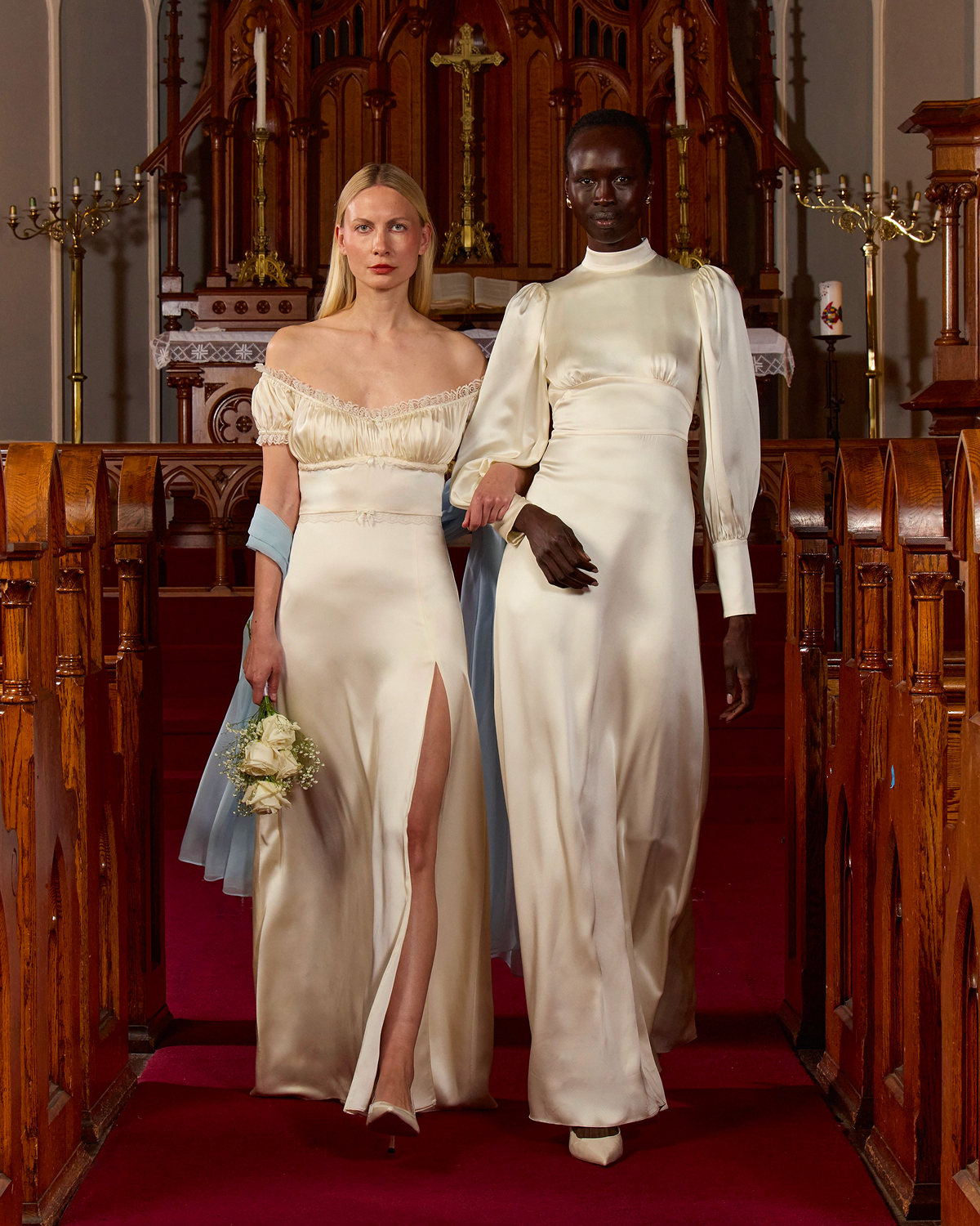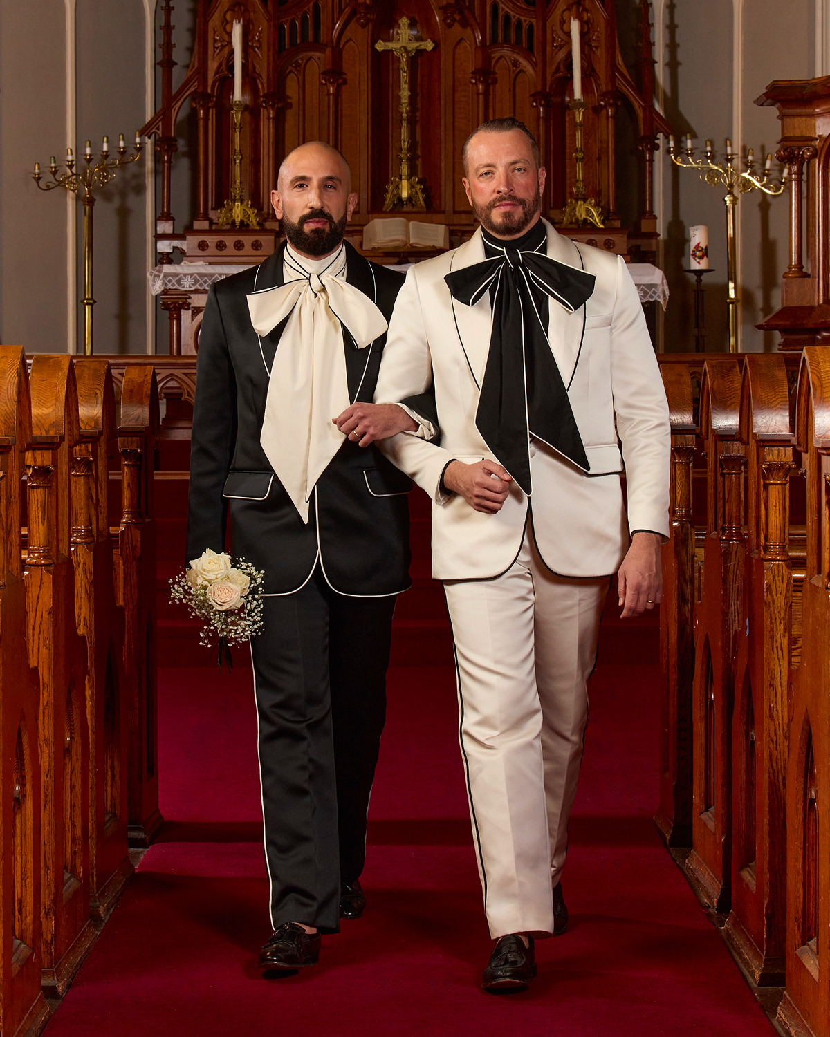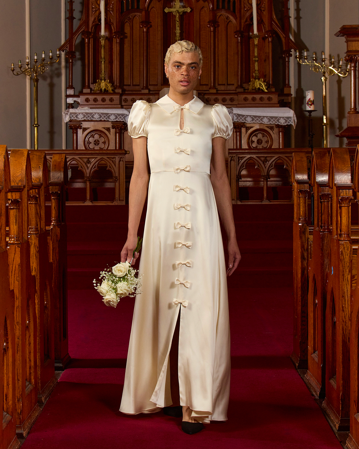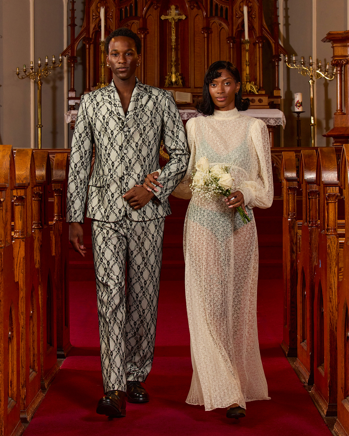 Tanner Fletcher’s 2026 bridal debut wasn’t just a show, but a full wedding experience. St. Paul’s German Evangelical Lutheran Church in downtown New York City transformed into a dreamy venue, complete with white roses and baby’s breath, a flower girl, a live harpist, and couples walking down the aisle as if they were about to say “I do.” The atmosphere was one of celebration, storytelling, and pure romance, heightened by Mostest’s whimsical ‘10 Commandments of Wedding Planning,’ and a showstopping moment where a real couple—who met on Tinder—exchanged vows mid-runway. The moment marked a heartfelt tribute to modern love, culminating in a donation to the ACLU in support of LGBTQ+ rights.
