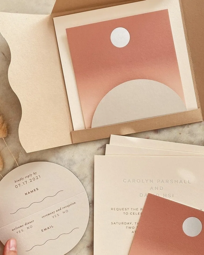 The key value of Shine is the timeless and classic aesthetic. The typography uses premium materials like silk ribbons, vellum jackets, and wax seals. Shine's designs feature a restrained palette and classic typefaces. Their invitations, enclosed in a family album, will not lose their relevance when the husband and wife turn to them again, even for a paper, even for a gold wedding.